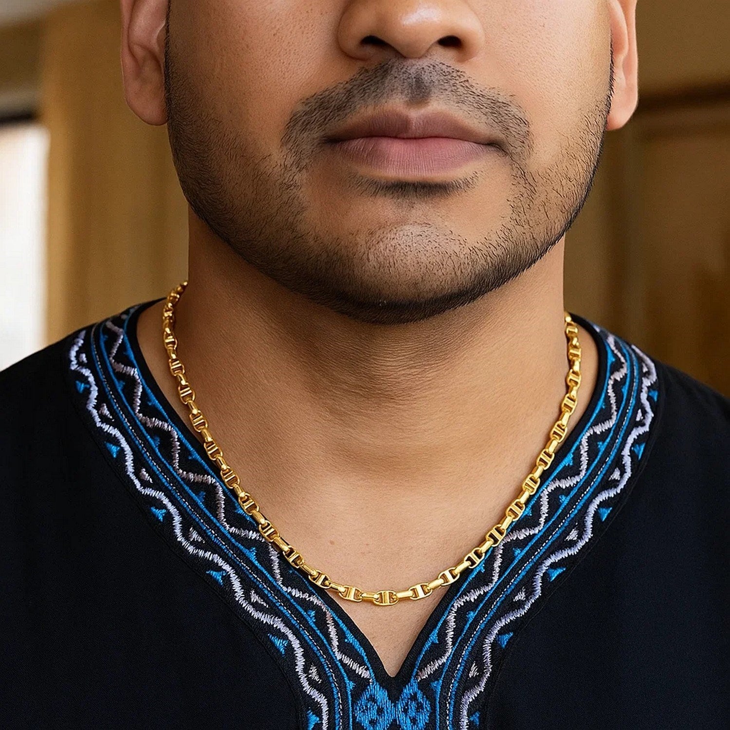 This anchor chain comes in 14k yellow gold and has a width of 4.5 millimeters.