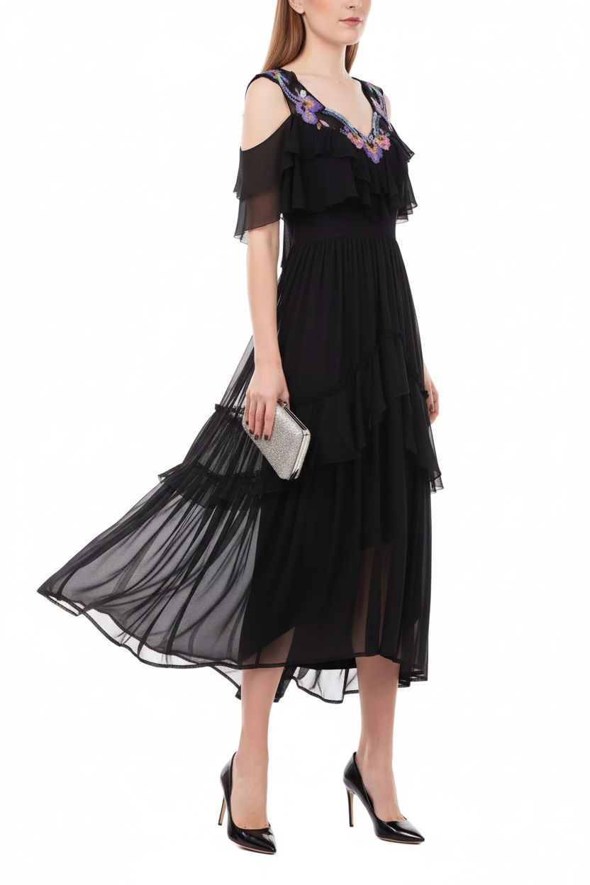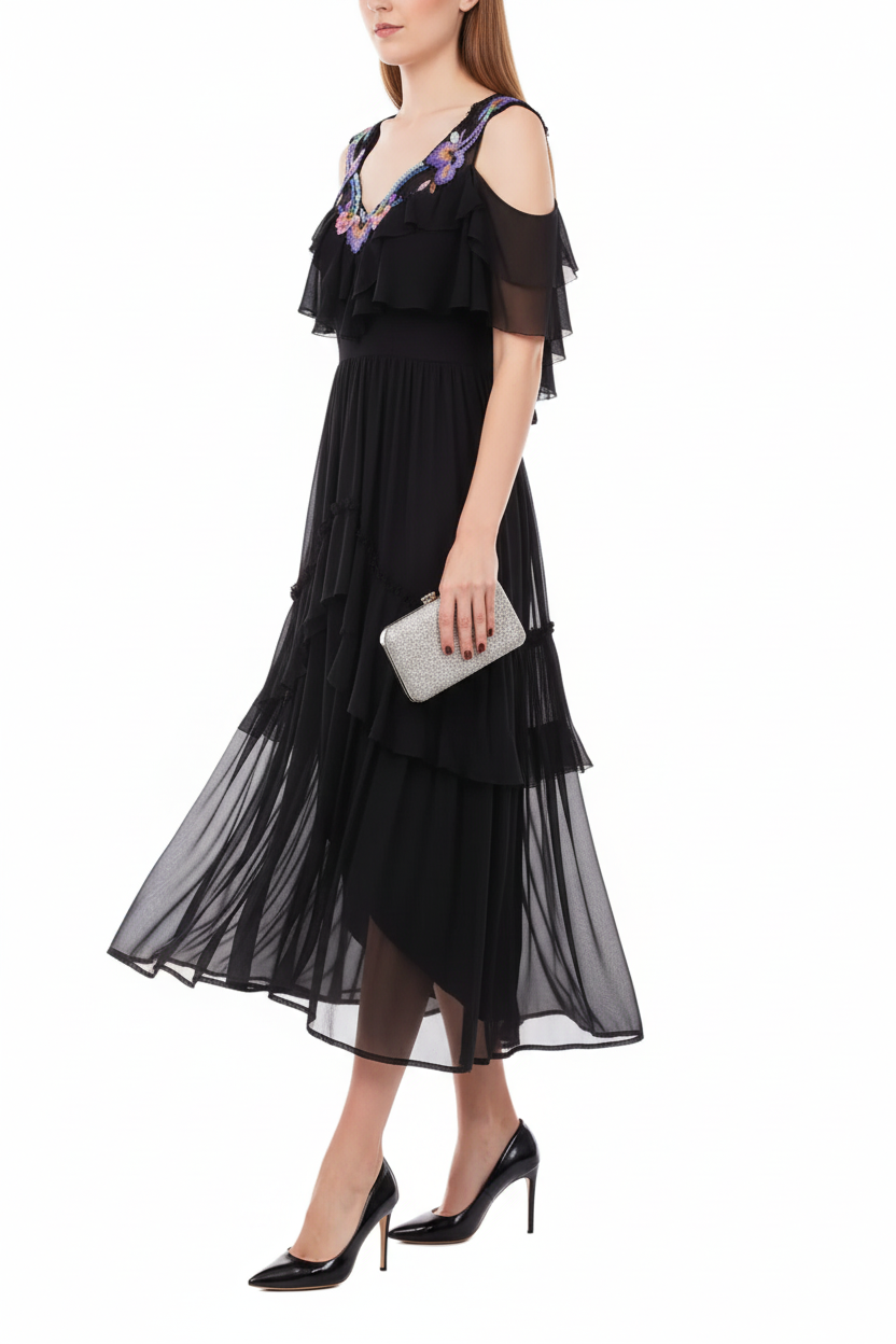 Alberta Ferretti Black Tiered Chiffon Dress with Floral Embroidery