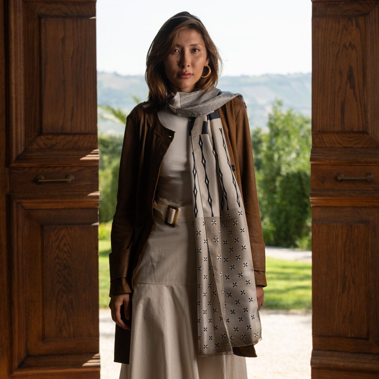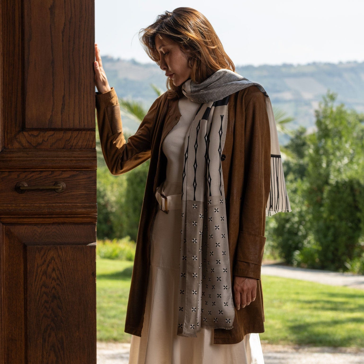 This scarf is a wearable piece of Italian art — its tones mirror the sunlit sands and soft light of the Adriatic. It’s a versatile staple that transitions beautifully from casual sophistication to evening polish.