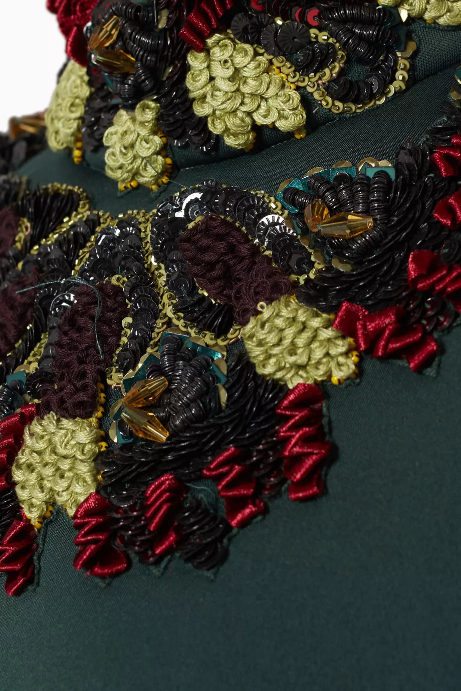 The luxury label Badgley Mischka presents this sophisticated gown from their latest collection, emphasizing detailed craftsmanship and a flattering silhouette. Made from neoprene for a modern touch, the design is enhanced with sequins, beads, and jewel-toned embroidery, creating an opulent and refined appearance.