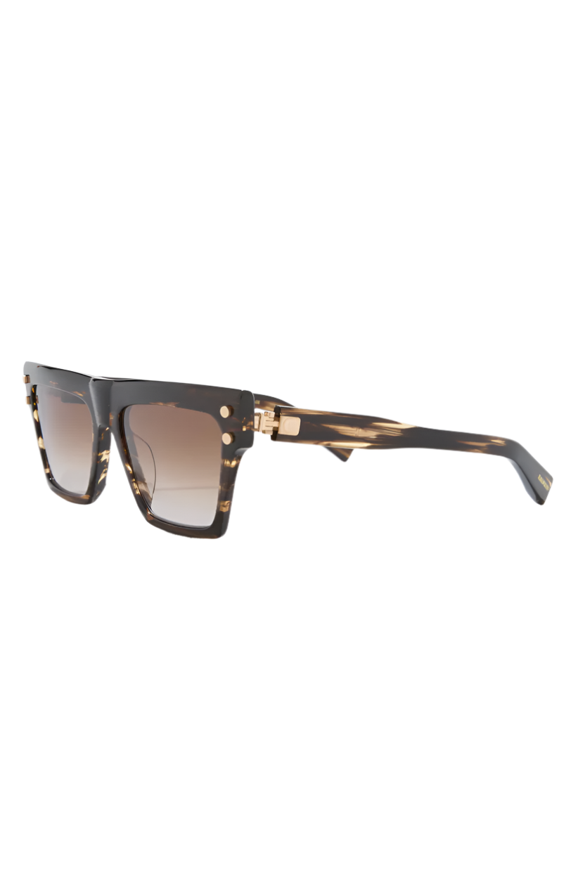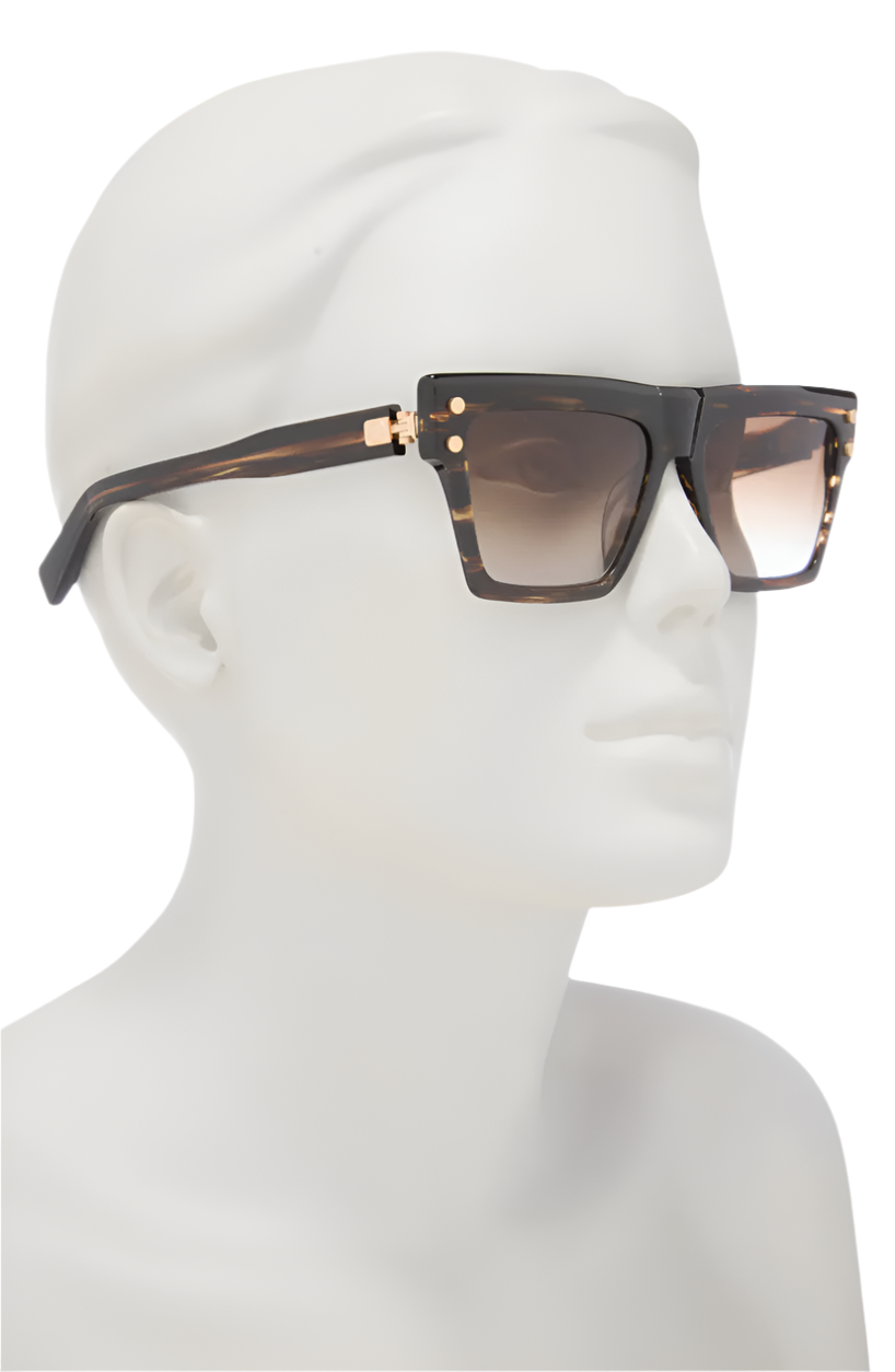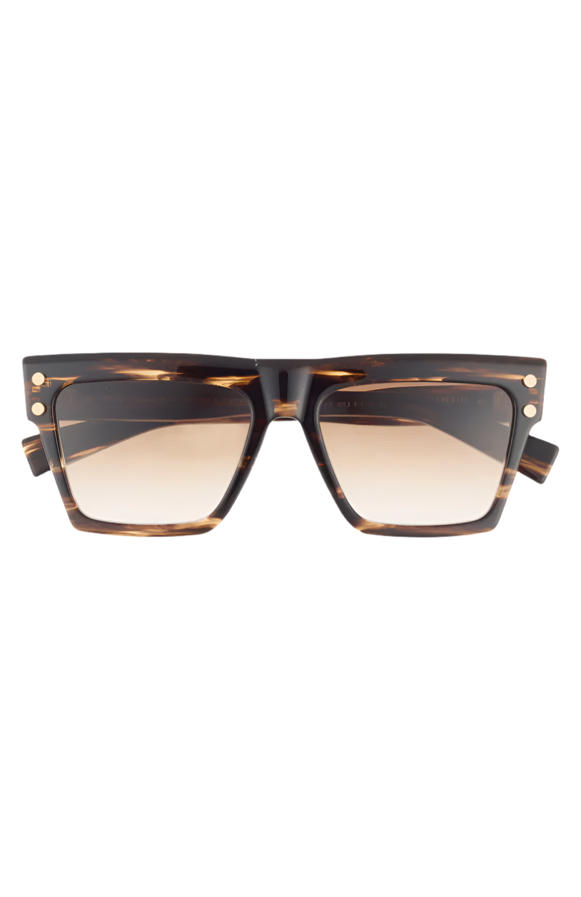 Balmain Novelty 54mm Square Sunglasses feature bold square frames accented with shiny hardware for a distinctive style. Crafted for those who set trends, these sunglasses enhance any outfit. They have a 54mm lens width, 17mm bridge width, and 145mm temple length, offering full UV protection. Made from a combination of acetate and metal for durability and comfort.
