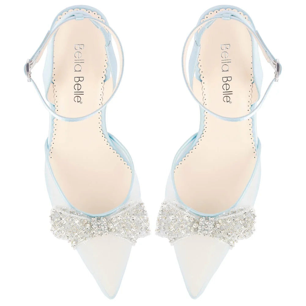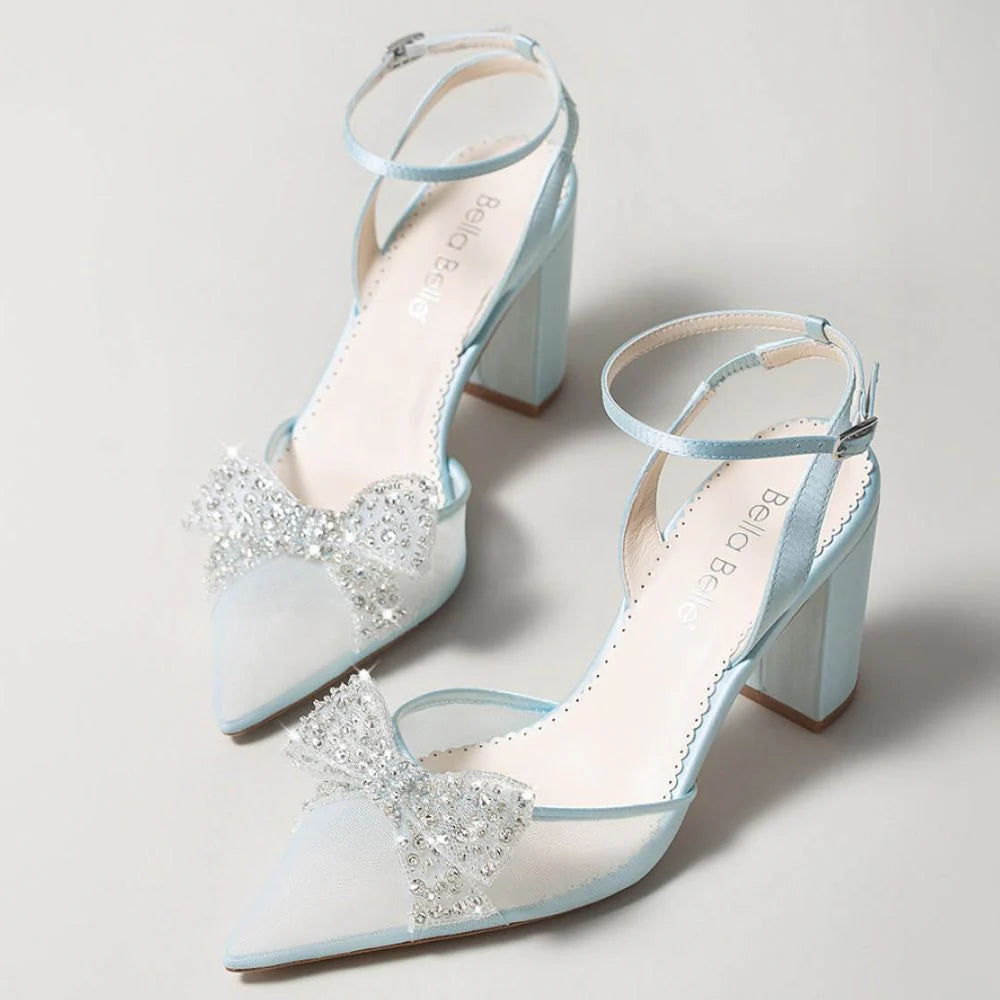 The Bella Belle Athena heels capture the essence of something blue with a touch of sparkle and timeless grace. These handcrafted 3-inch block heels feature exquisite crystal-embellished bows that shimmer beautifully without catching on your gown. Designed with removable ankle straps, Athena offers versatility for both ceremony and reception—secure and supportive when you need it, effortlessly elegant when you don’t.