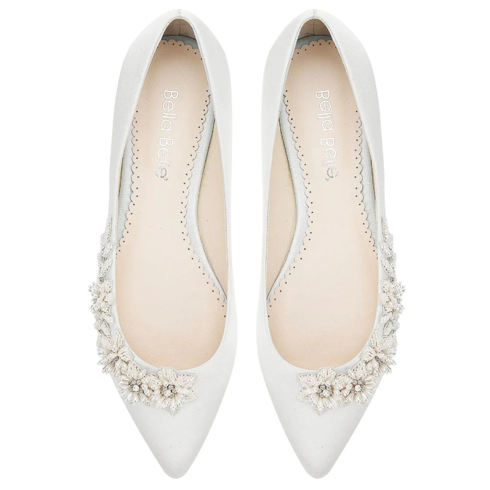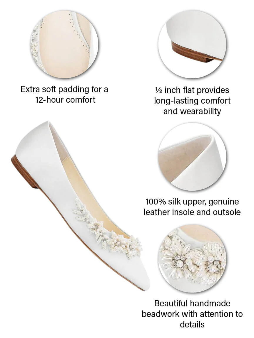 The Bella Belle Daisy Ivory flats bring delicate femininity and understated elegance to bridal footwear. Designed with handcrafted 3D floral beadwork made of luminous pearls and ivory beads, these 0.5-inch flats offer a soft romantic look without sacrificing comfort. The pointed toe adds a refined silhouette, while the signature plush padding ensures effortless wear from morning preparations to the final farewell. Daisy Ivory is the perfect choice for brides who want beauty, comfort, and quiet sophistication in every step.