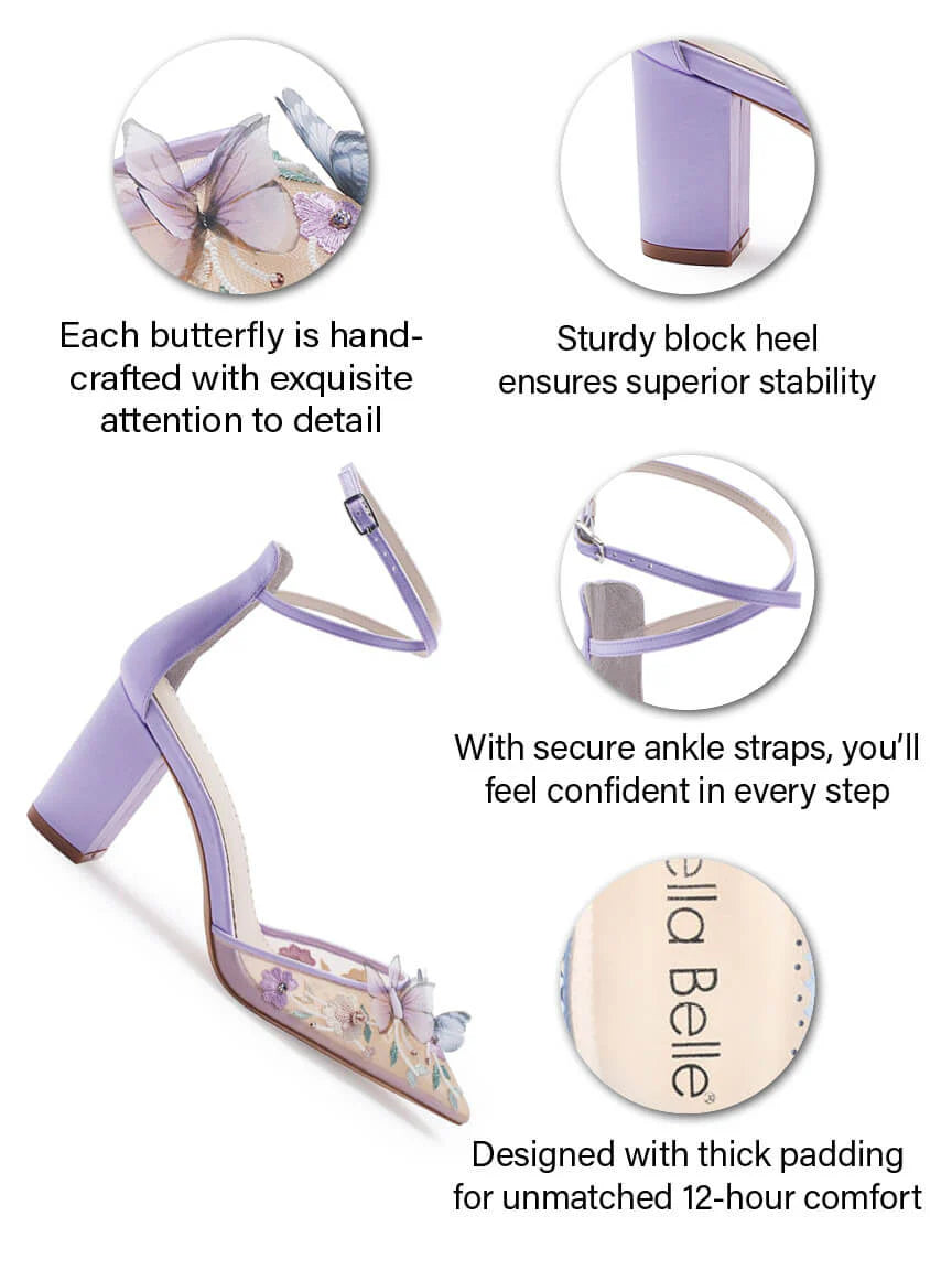 The Bella Belle Eliza heels bring whimsical elegance to life with their soft lavender hue and hand-crafted butterfly accents. Designed for brides and dreamers alike, these 3-inch block heels feature delicately embroidered flowers and fluttering chiffon butterflies that catch the light with every step.