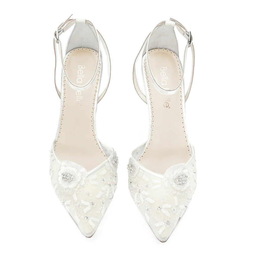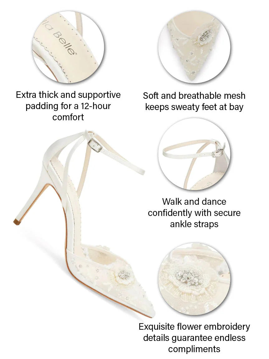 Norah is everything a bridal heel should be—feminine, flattering, and endlessly elegant. The airy mesh and delicate hand-stitched florals create a dreamlike finish, while the structured stiletto and ankle strap design offer poise and stability.