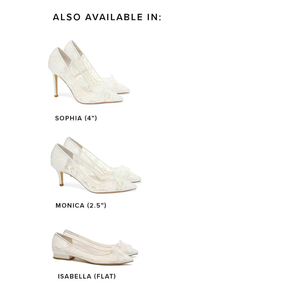 Gracefully timeless, the Bella Belle Sophia pump pairs intricate floral lace over airy ivory mesh with a petite bow at the vamp for a romantic, polished finish. The 4-inch silhouette elongates the leg, while Bella Belle’s signature 12-hour padded insole keeps you comfortable from aisle to last dance. A classic choice for brides who want elegance without compromise.