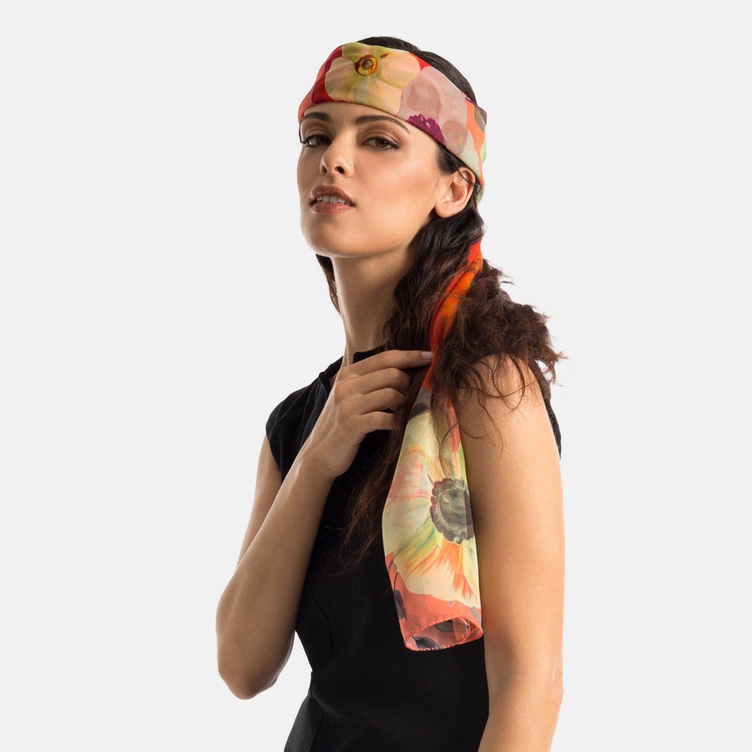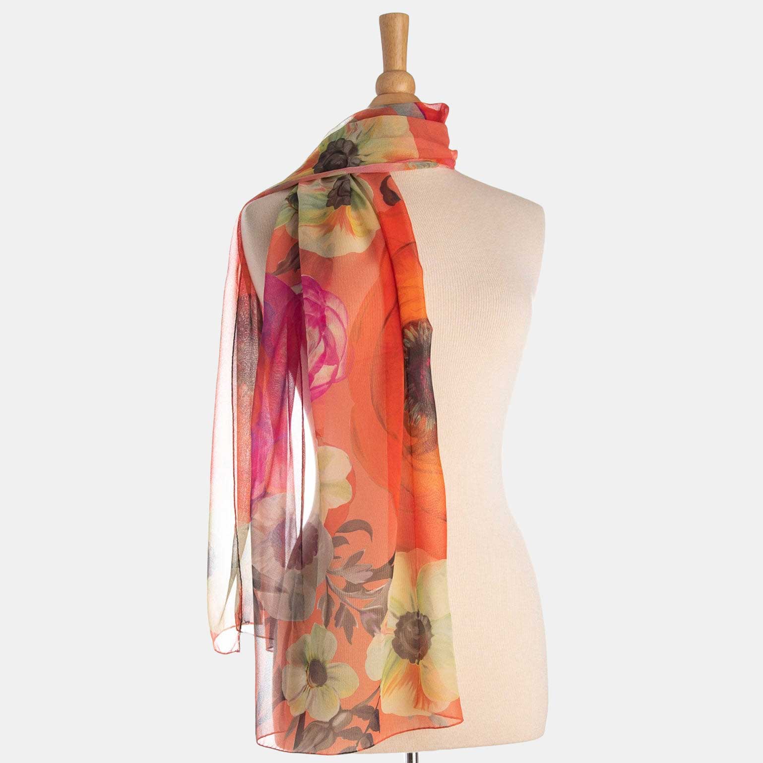 Named after the famous piazza in Rome, Campo de' Fiori (field of flowers), this sheer silk Georgette long scarf has a floral print in shades of coral and pink.