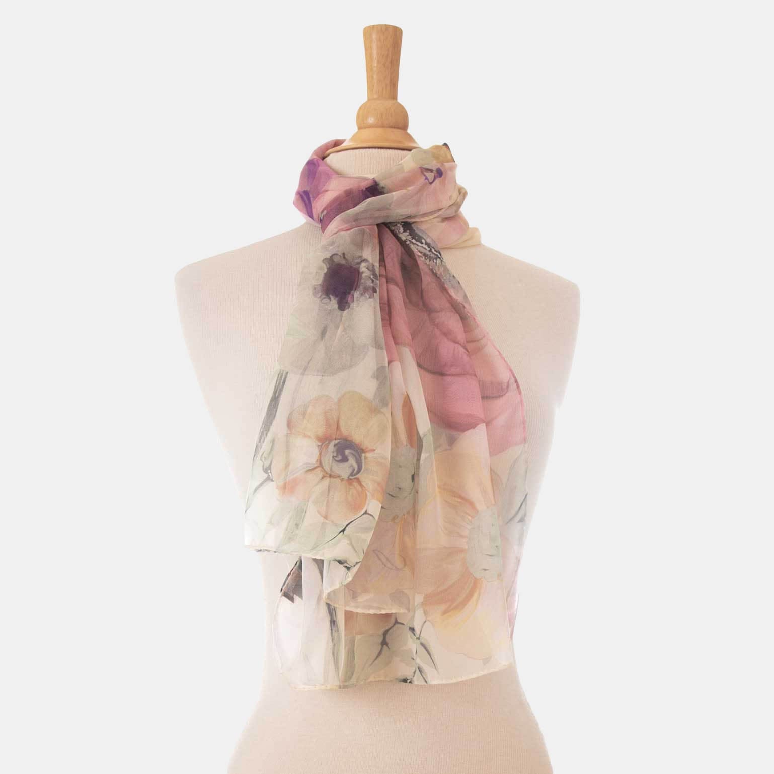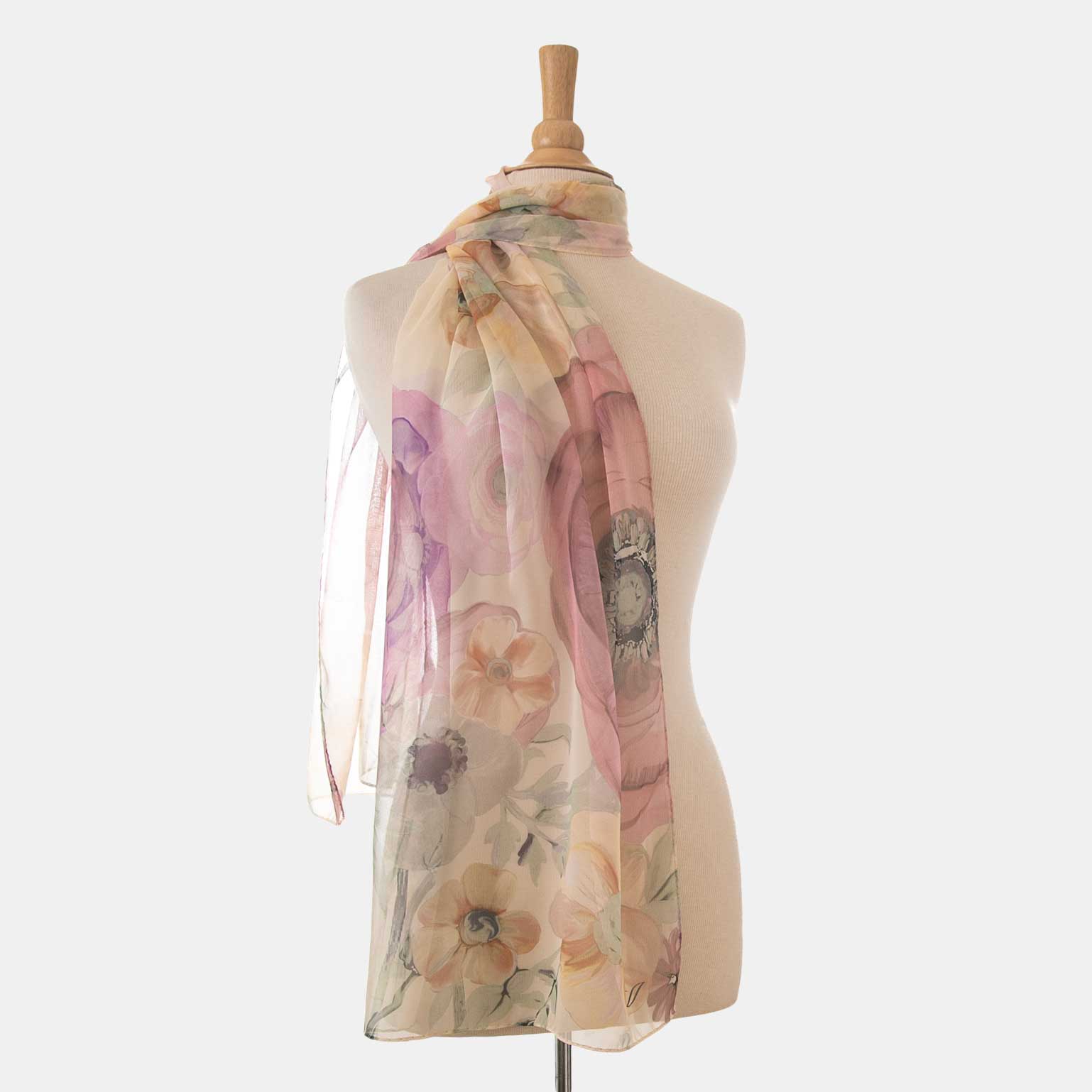 Named after the famous piazza in Rome, Campo de' Fiori (field of flowers), this sheer silk Georgette long scarf has a floral print in shades of mauve, apricot and pink with a touch of mint on ivory.