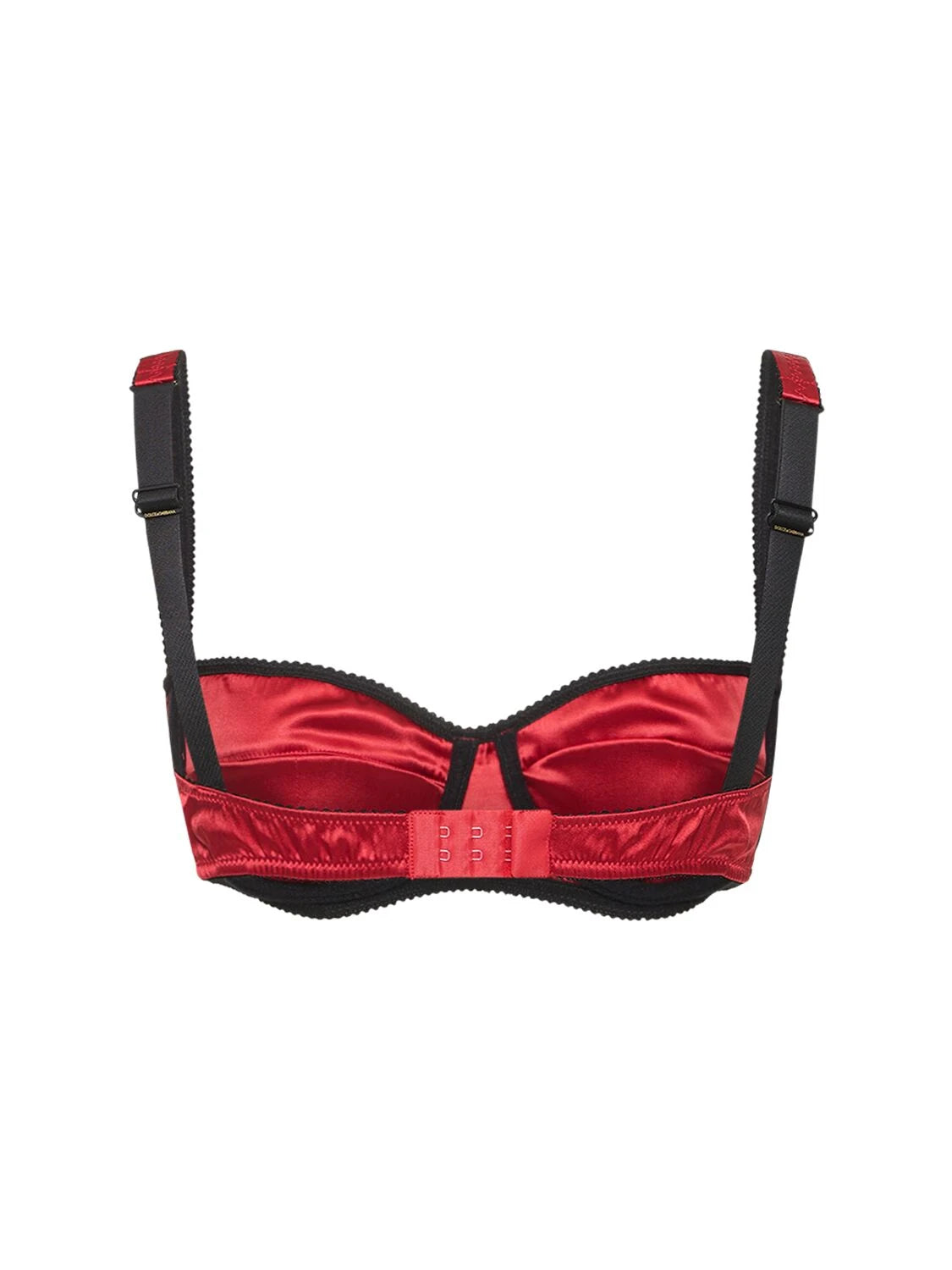 Elevate your lingerie collection with this striking red satin balconette bra by Dolce & Gabbana. Designed with sculpted underwire cups and a structured silhouette, it delivers both support and statement appeal. Finished with contrast black trim and adjustable straps, this piece blends sensuality with signature Italian craftsmanship. Wear it under a sheer blouse or as part of a layered look—either way, it’s made to be seen.