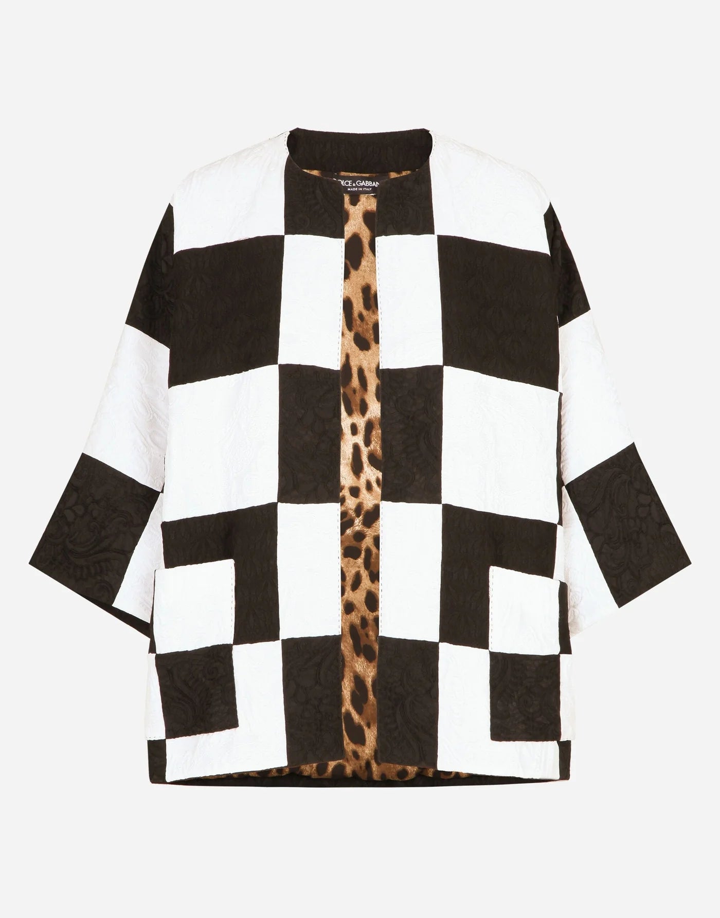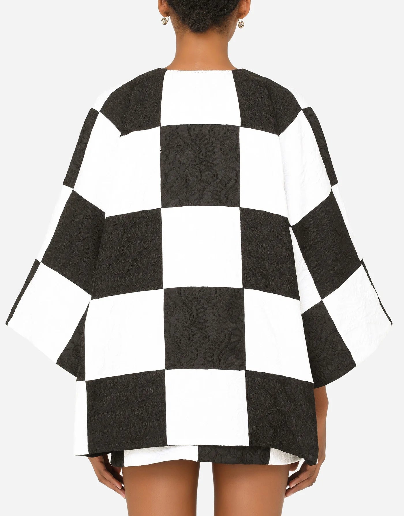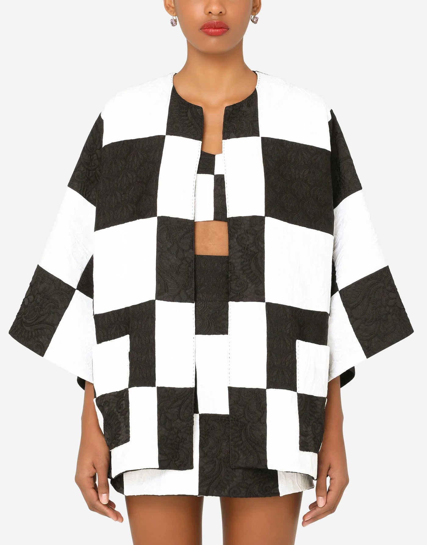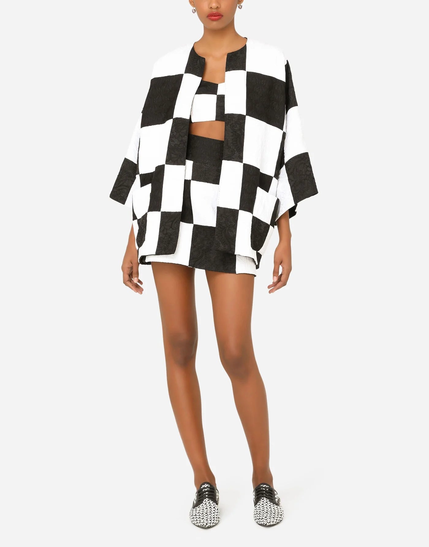 Damier Patchwork Jacquard Blazer by Dolce & Gabbana. Crafted in a dramatic black and white checkerboard pattern, the oversized silhouette is cut from intricately textured jacquard fabrics, each block revealing subtle floral motifs that reflect the house’s signature attention to detail. The collarless design and wide sleeves offer a modern, architectural shape, while the seamless front keeps the look clean and striking. Pair it with the matching set or wear it layered over all-black for graphic contrast.