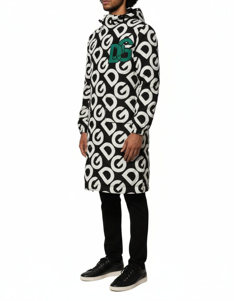This Dolce & Gabbana men's jacket showcases an eye-catching black and white DG logo print with subtle green accents. Made in Italy with meticulous craftsmanship, the hooded coat combines style and comfort for everyday wear.