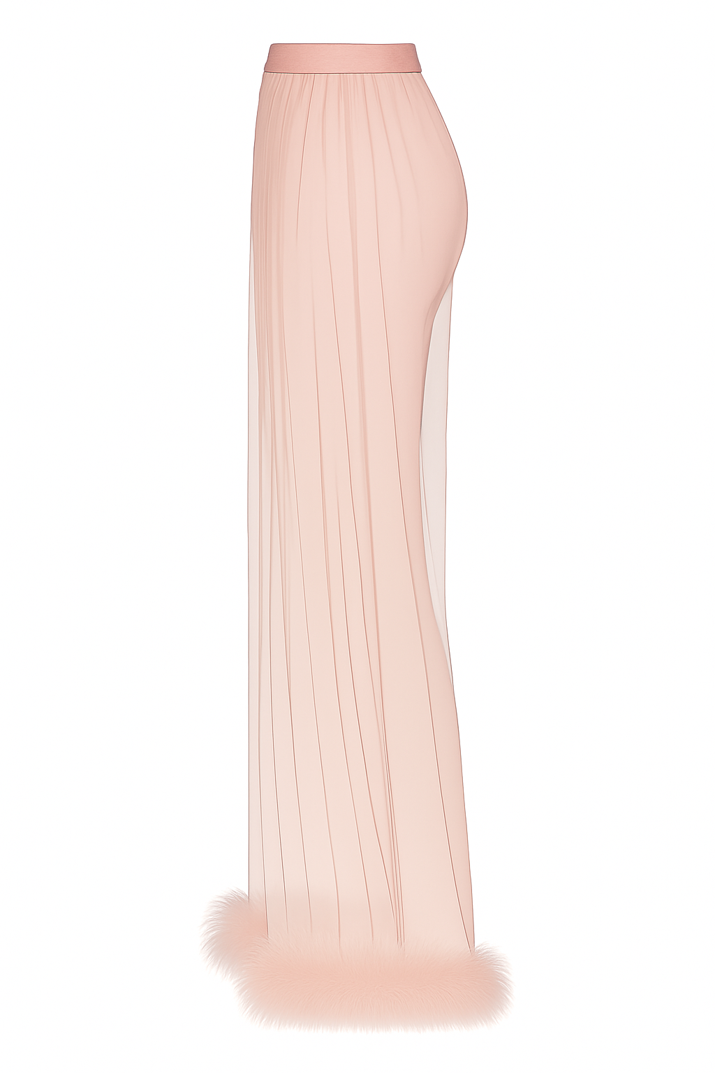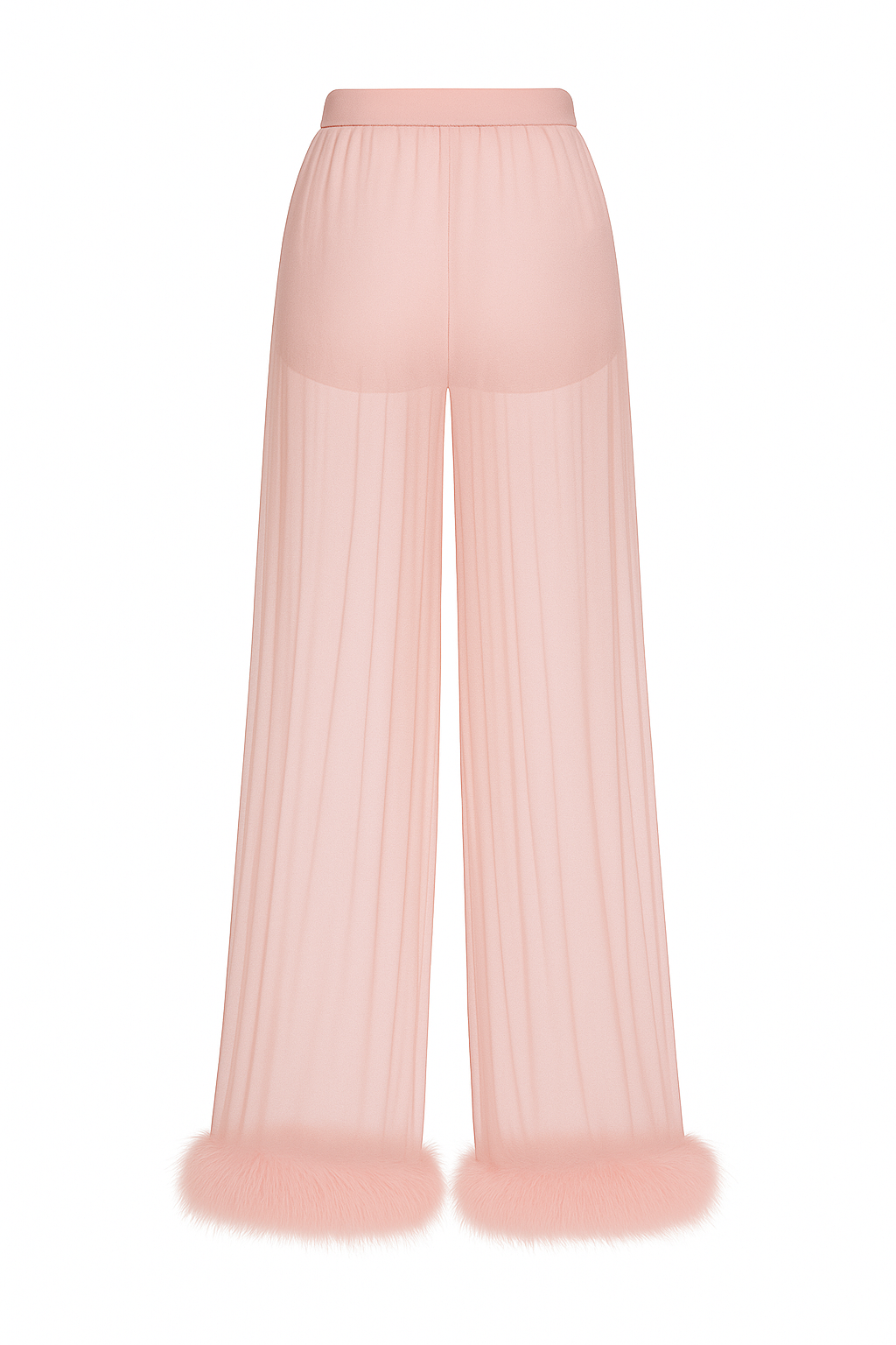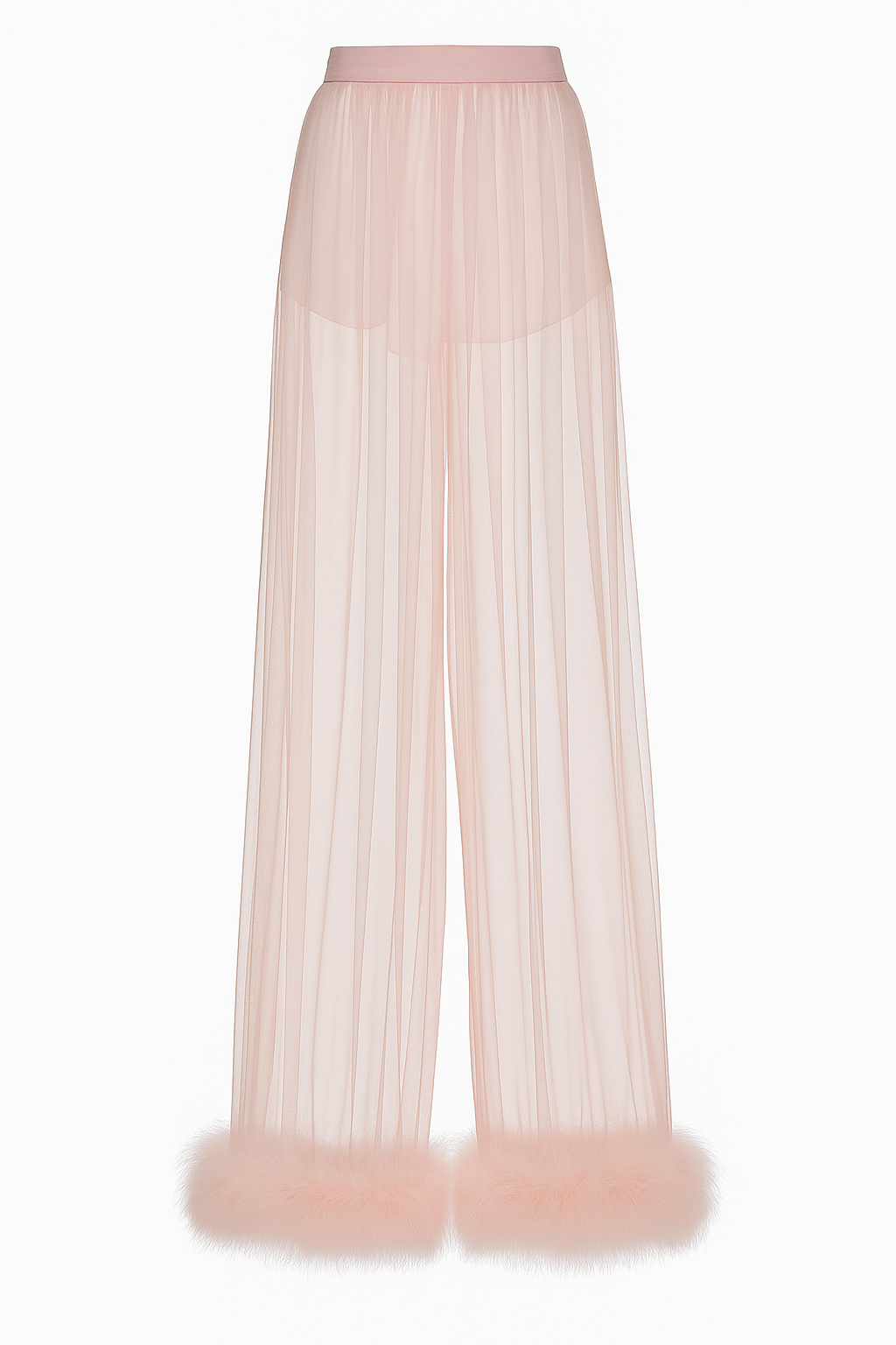 Delicate, dreamy, and designed to turn heads—these sheer blush pink tulle pants bring a touch of vintage glamour to modern loungewear. The wide-leg silhouette flows effortlessly, while the marabou feather trim at the hem adds luxe texture and feminine charm. Lightweight and versatile, they’re perfect for layering over lingerie, bodysuits, or elevated resortwear.