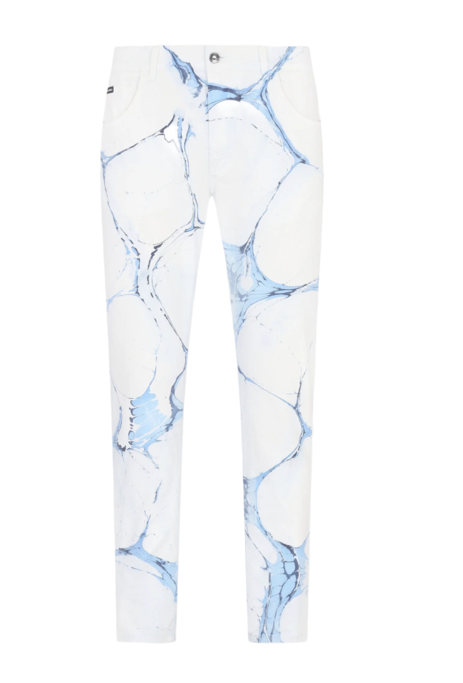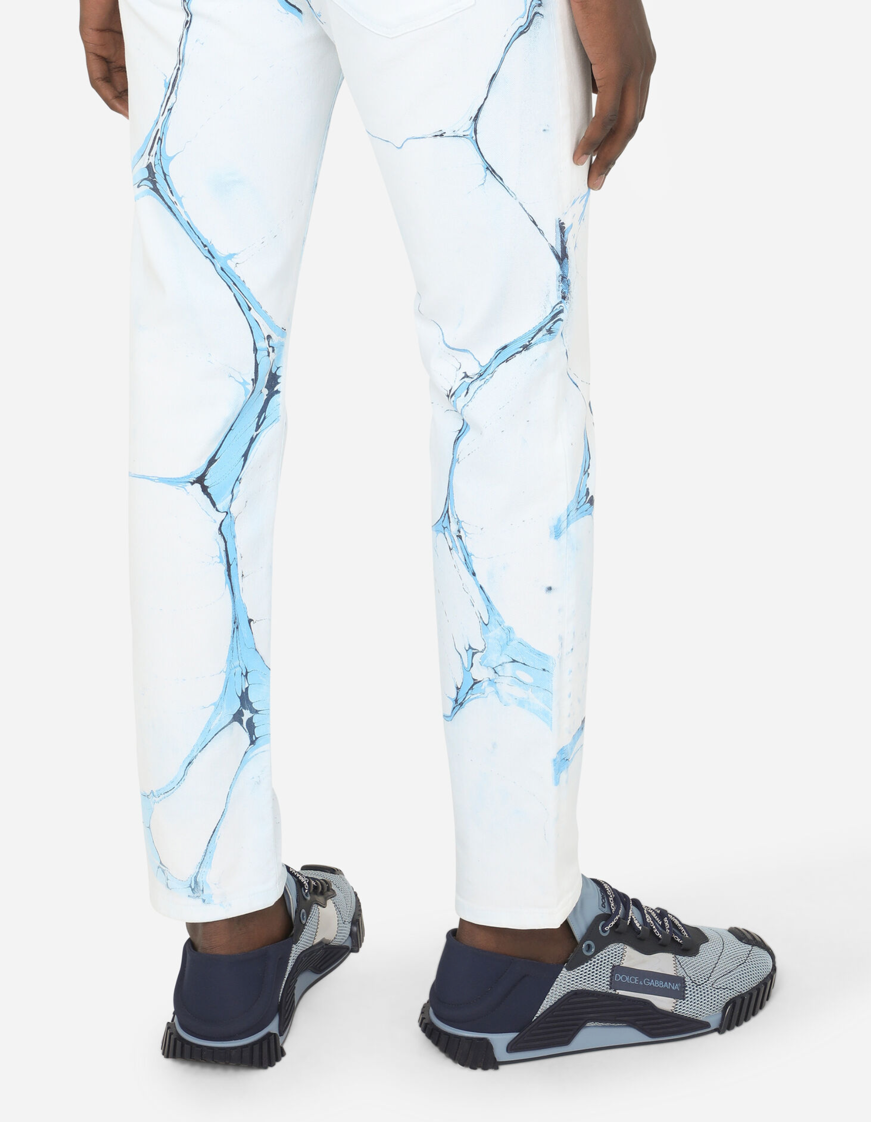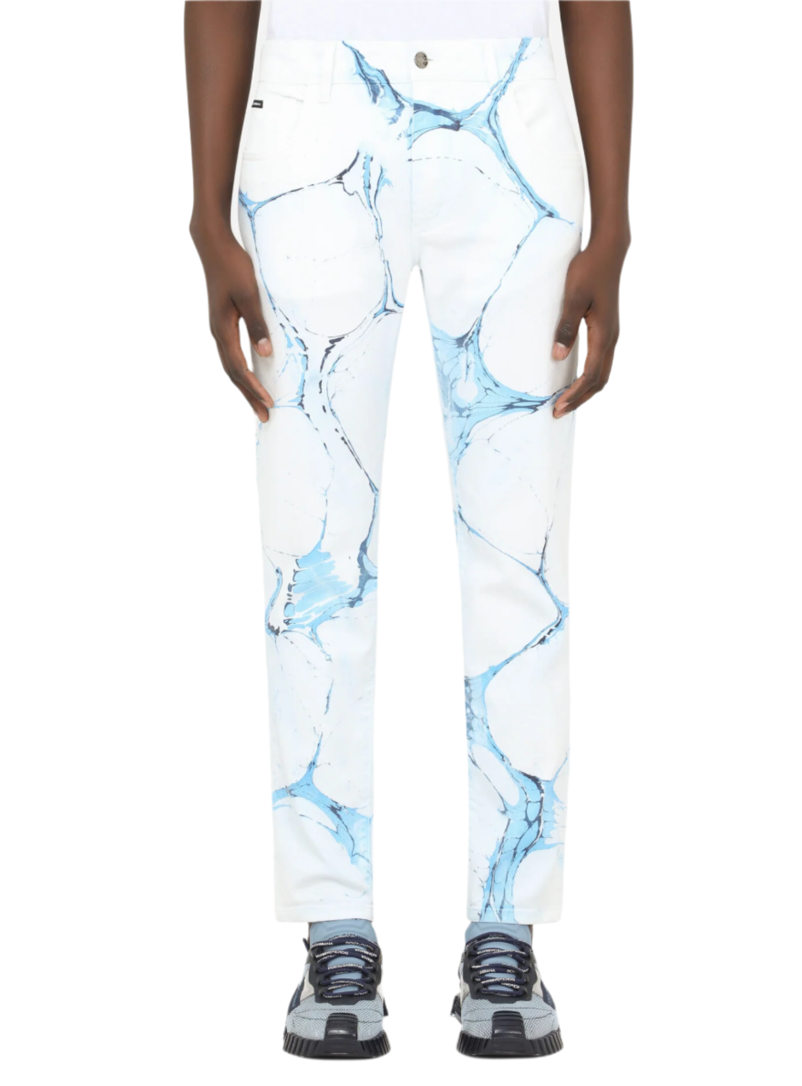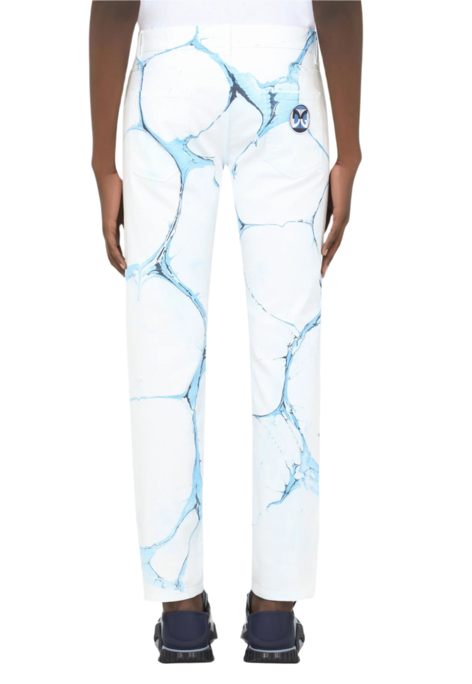 The Dolce & Gabbana "Parco dei Principi" collection draws inspiration from the sea’s vibrant colors and geometric majolica patterns, blending white and blue linen to craft distinctive, refined garments. This collection uses lightweight fabrics such as twill, linen, and poplin, ideal for all-day wear. These white skinny jeans are made from stretch denim featuring a subtle light blue brushstroke design. They have a slim fit, five-pocket style, concealed zipper and button closure, and a DG patch on the back pocket. Measurements for size IT 48 include a 14 cm crotch, 16.5 cm hem width, and 105 cm outer leg length. The model is 185 cm tall and wears size IT 48.