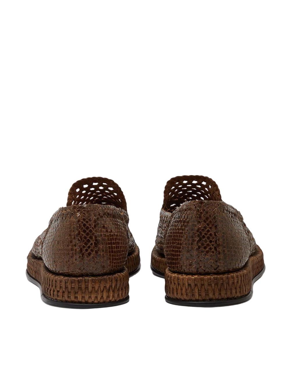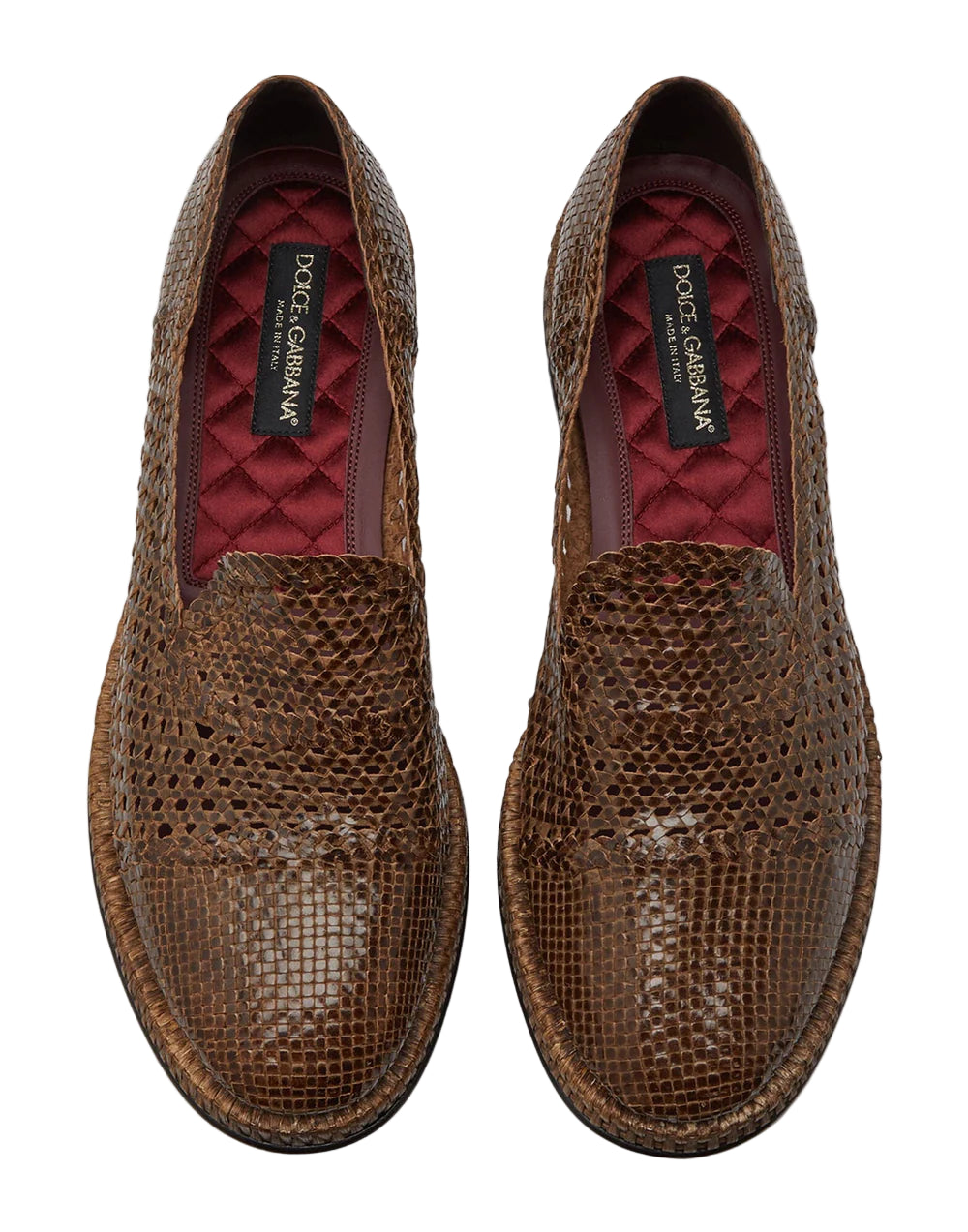Easy, refined, and perfect for warm-weather dressing, these Dolce & Gabbana loafers are crafted from woven brown leather with a rich, textured finish. The airy construction offers breathable comfort, while the slim profile and almond toe keep the look sharp and polished. A braided-effect welt and quilted burgundy insole highlight the brand’s signature Italian craftsmanship.