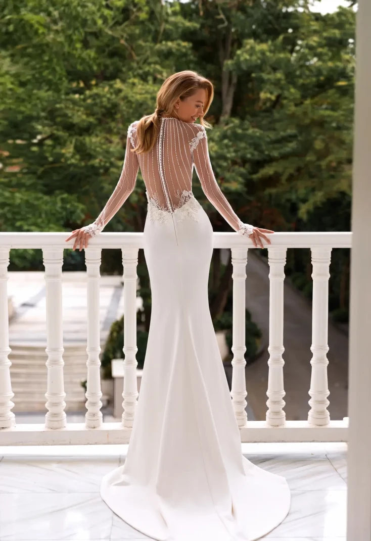 Sculpted sophistication meets soft allure in the EDESIA gown. Crafted from a smooth, structured fabric that hugs the figure, this fitted silhouette wedding gown is elevated by a sheer illusion neckline and sleeves adorned with fine beaded embroidery and delicate floral appliqué. The gown’s clean front slit adds a graceful hint of allure, while the back stuns with a button-down illusion panel and sweeping train. A perfect balance of modern edge and romantic elegance.