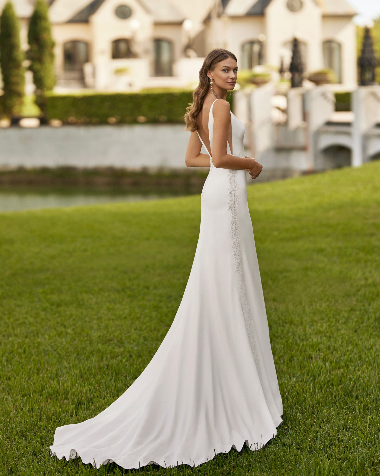 Step into timeless elegance with the Eliona wedding dress by Rosa Clará. This two-piece mermaid gown is crafted from luxurious stretch crêpe, designed to flatter the silhouette with its clean, fluid lines. Delicate lace and beadwork trace the waist and side seams, adding a touch of intricate romance. The plunging V-neckline and dramatic V-back highlight modern sophistication, while the ethereal cape draped over the shoulders lends a regal, fashion-forward statement. Perfect for the bride seeking both drama and refinement, Eliona is a gown that effortlessly balances contemporary design with classic bridal elegance.