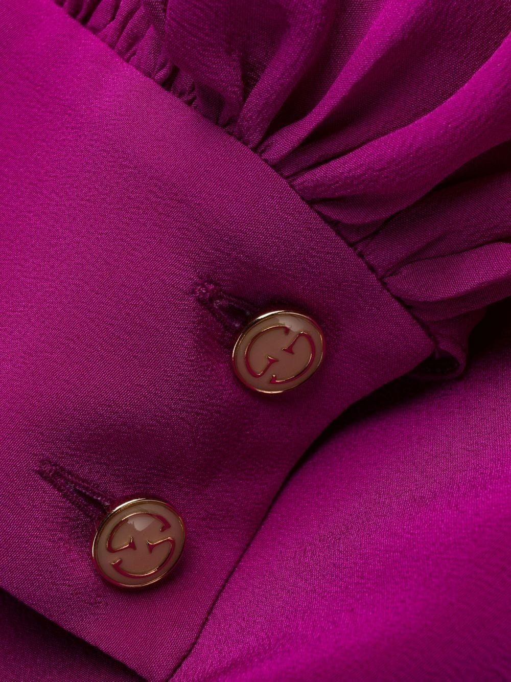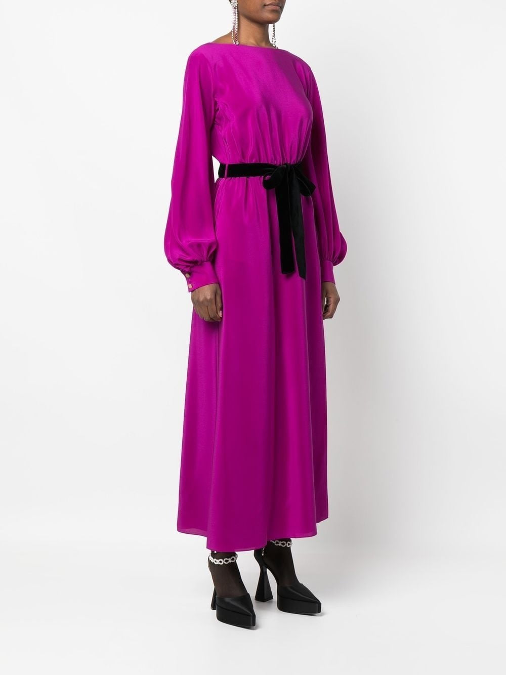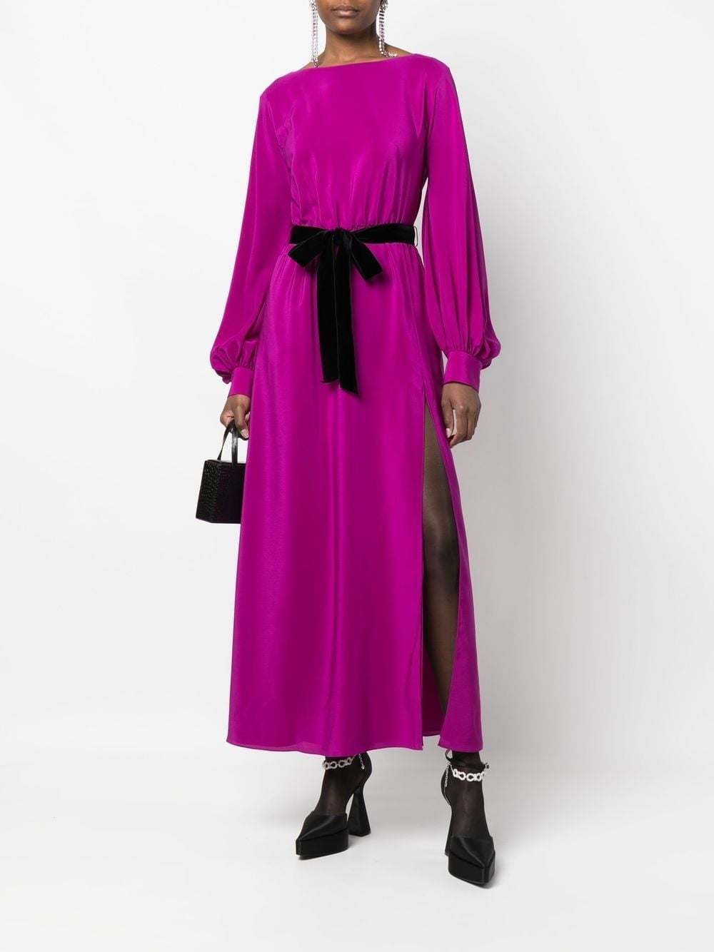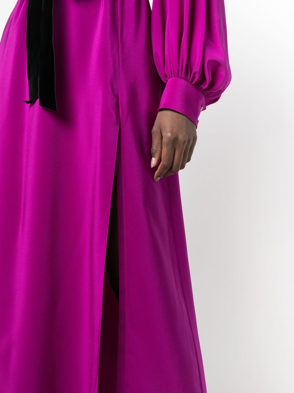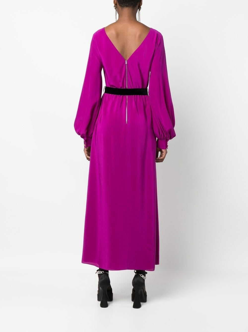 Striking in silhouette and color, this fuchsia Gucci dress is crafted from fluid silk with a graceful drape and high side slit for modern movement. The long sleeves gather gently at the cuffs while the open V-back and velvet belt add contrast and structure. A subtle bateau neckline balances the bold tone with elegance. Perfect for evening events, cocktail hours, or styled down with boots for a fashion-forward daytime look.