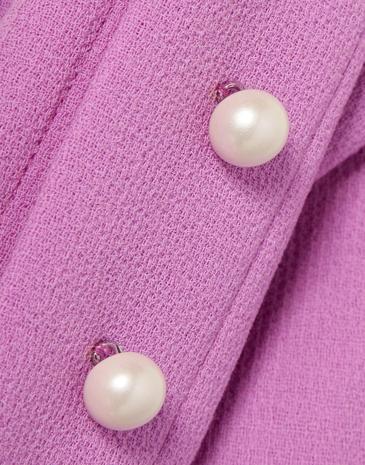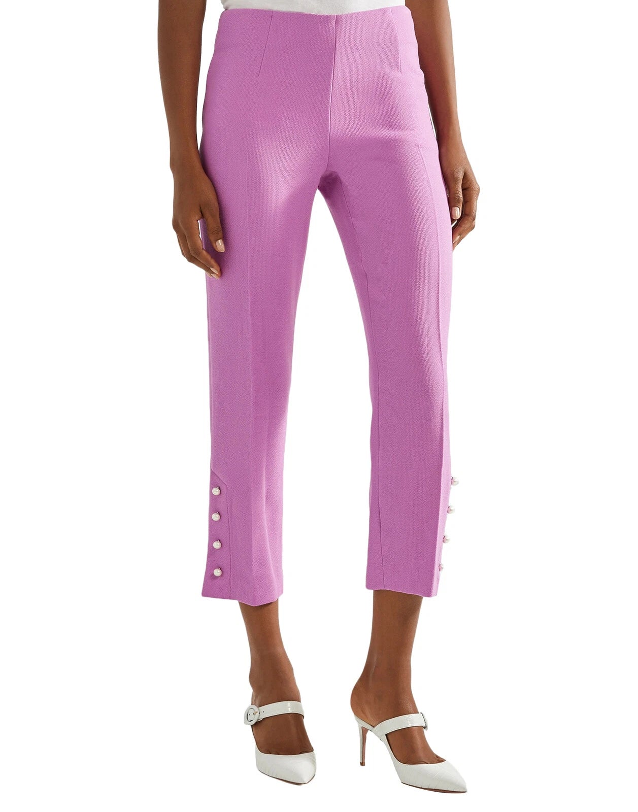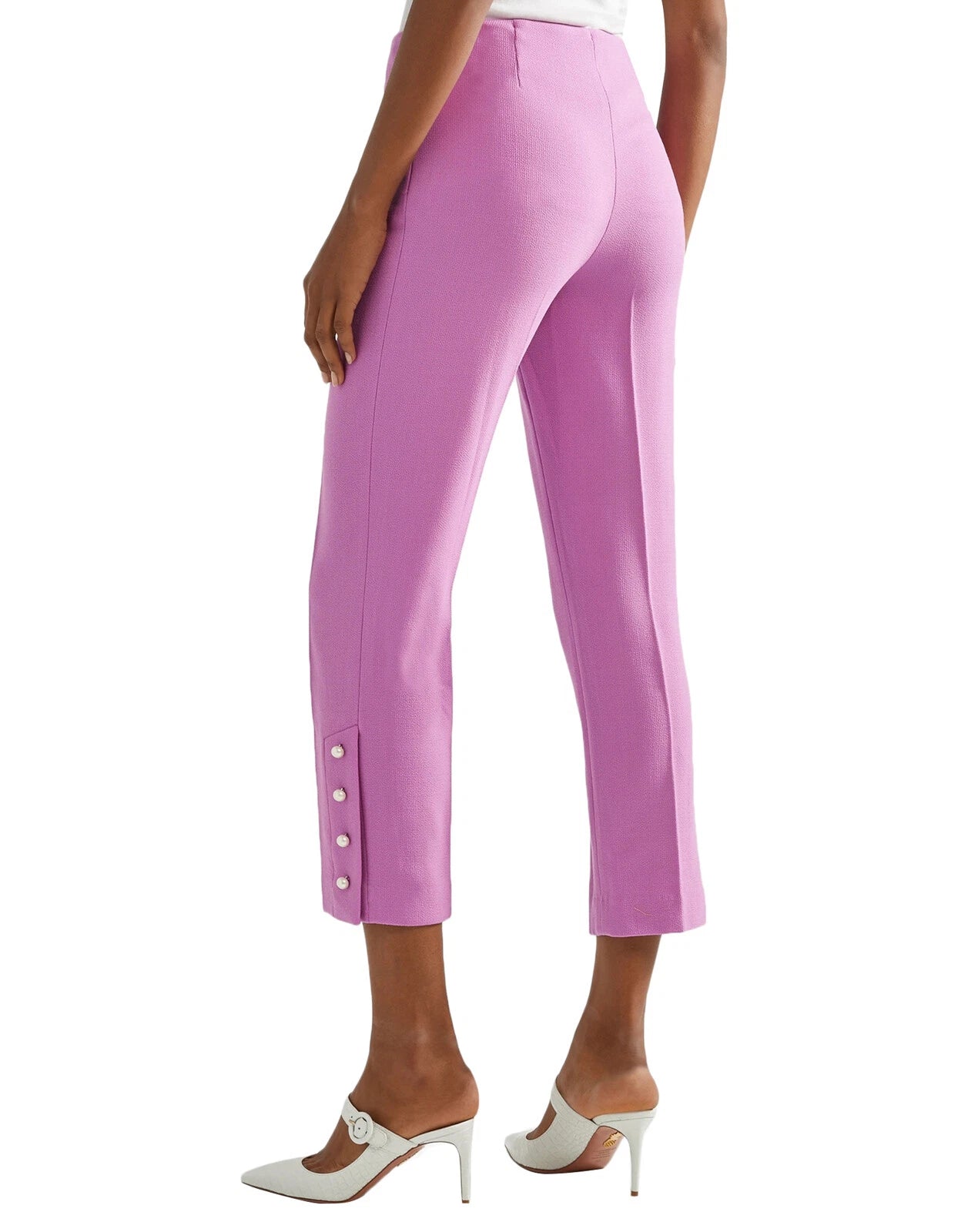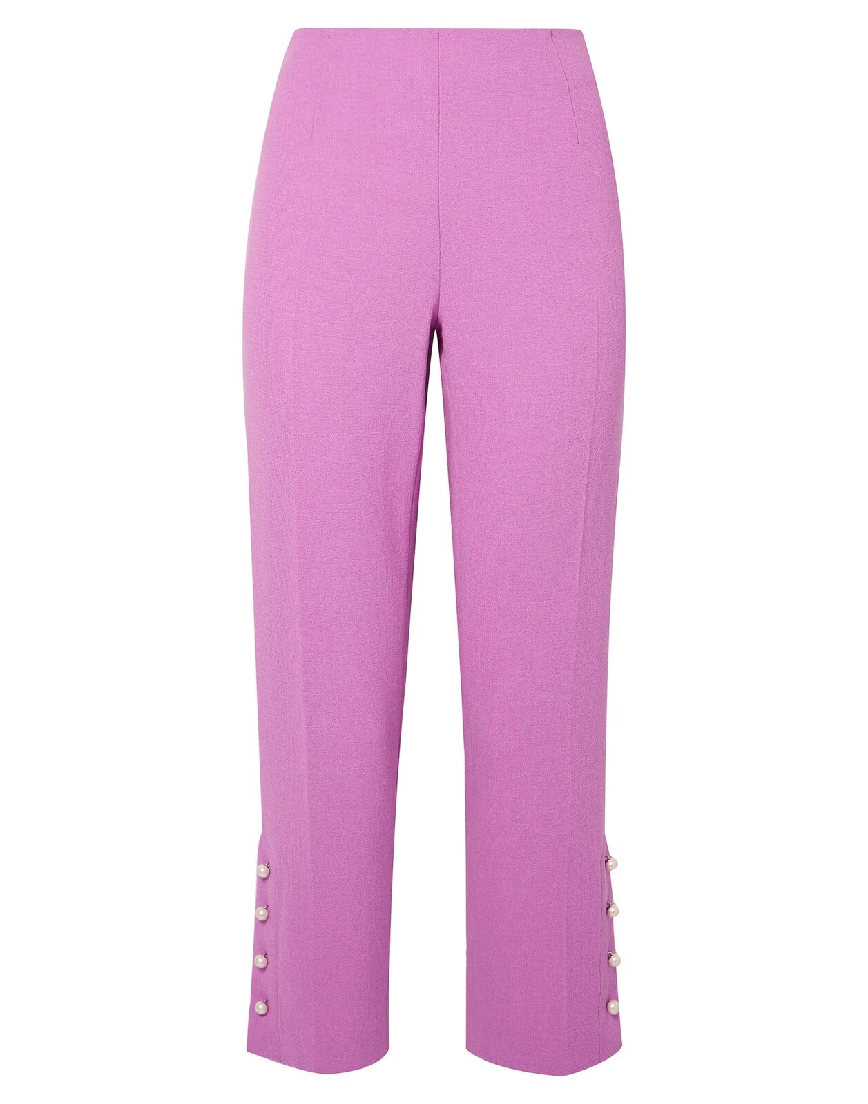 Lela Rose cropped pants, tailored in a vibrant orchid-pink stretch-crepe that offers both structure and ease. These high-rise trousers feature a slim, straight-leg cut that flatters the silhouette, finishing just above the ankle for a modern, feminine fit. The standout detail: delicate faux-pearl buttons lining each hem for a polished, elegant finish. A hidden side zip ensures a smooth, seamless profile. Style them with a crisp blouse or a matching blazer for a bold yet refined look. Inseam -26 in.