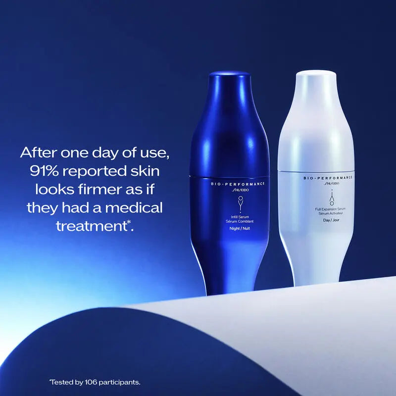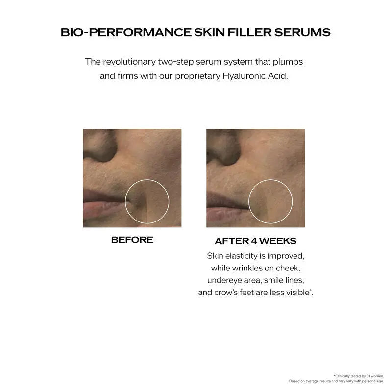 Step 1: Evening: Infill Serum delivers shrunken Hyaluronic Acid molecules to be more effectively absorbed into skin.