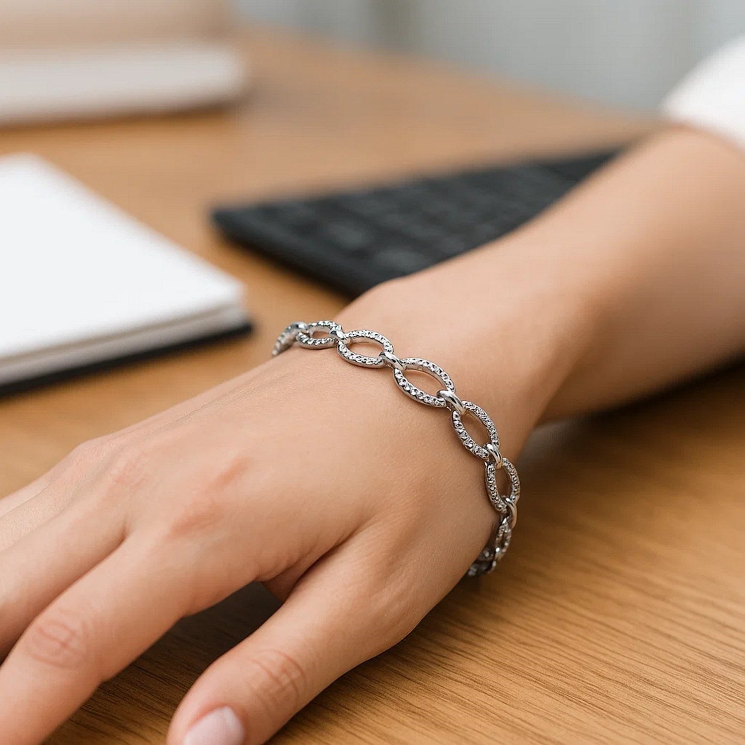 Textured Oval Link Bracelet in 14k White Gold