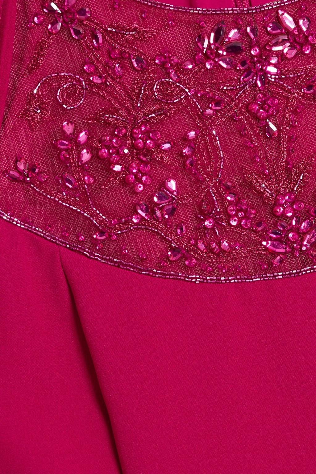 This Theia gown makes a bold, elegant statement with its cape-effect sleeves and beautifully embellished neckline. Crafted in smooth crepe, the fitted column silhouette creates a sleek and lengthening line, while the pleated cape drapes effortlessly over the shoulders for dramatic movement. The sheer yoke is accented with radiant beadwork, adding texture and a touch of sparkle to this sophisticated, modern evening gown.