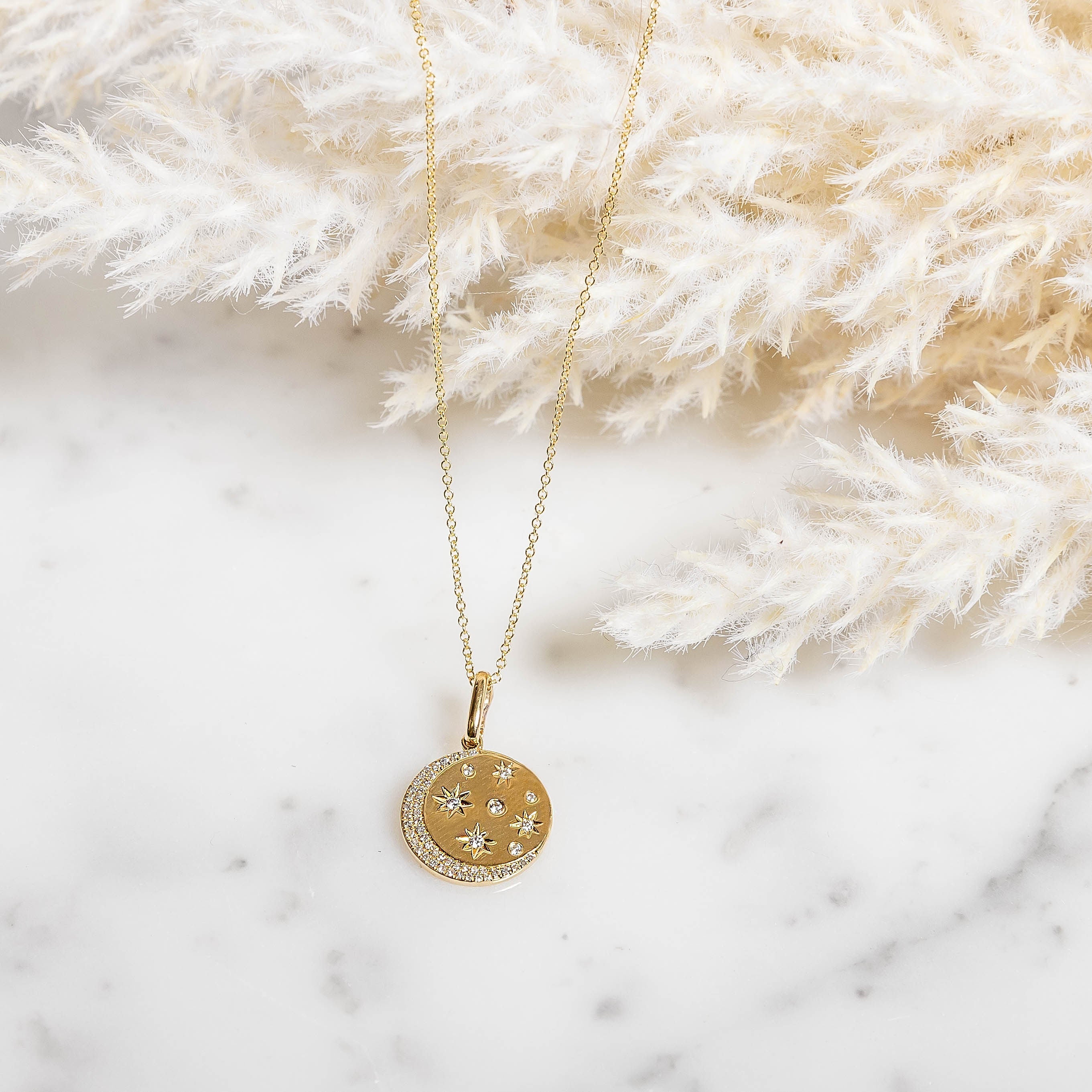This necklace features a 14k solid gold celestial pendant adorned with diamonds. It showcases a moon and stars design. The adjustable chain measures approximately 16-18 inches, with the pendant disc about 15mm in diameter. The total weight is around 2 grams, and the diamonds have a combined carat weight of approximately 0.17ctw.