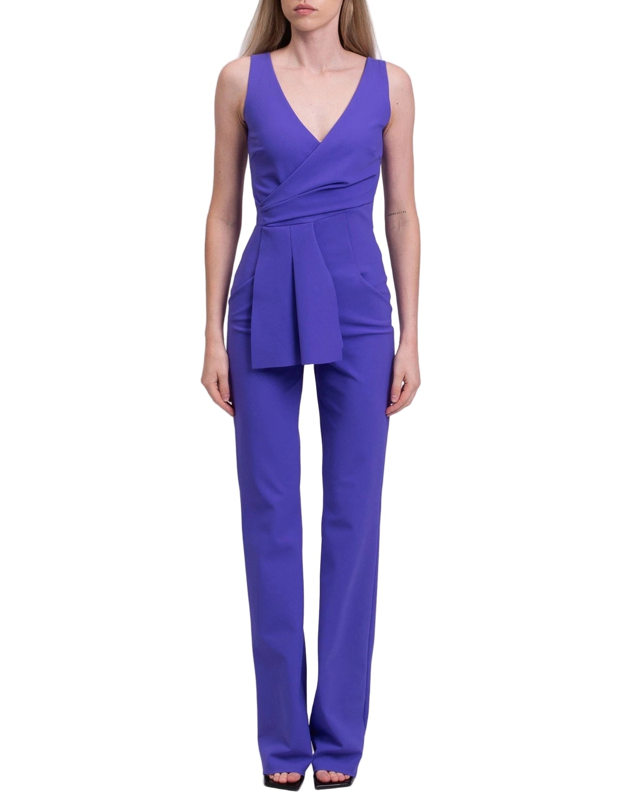 Bold yet refined, this Chiara Boni jumpsuit delivers effortless sophistication in a striking violet hue. Designed with a flattering sleeveless V-neck bodice, it features a wrapped waist detail with a draped panel that enhances the tailored silhouette. The straight-leg pants elongate the figure, making this a versatile piece for evening events, cocktail parties, or special occasions.