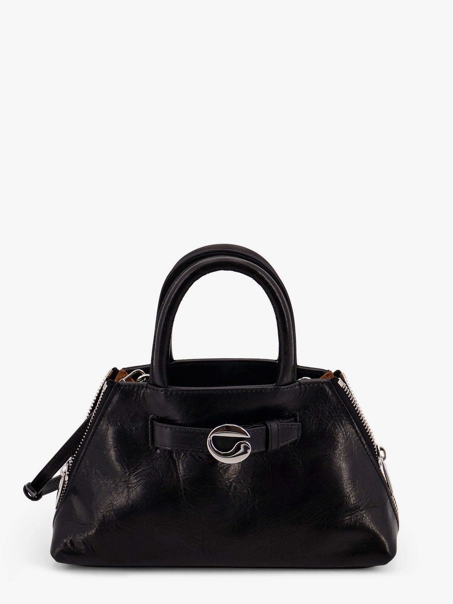Two leather handles and a removable and adjustable leather shoulder strap
