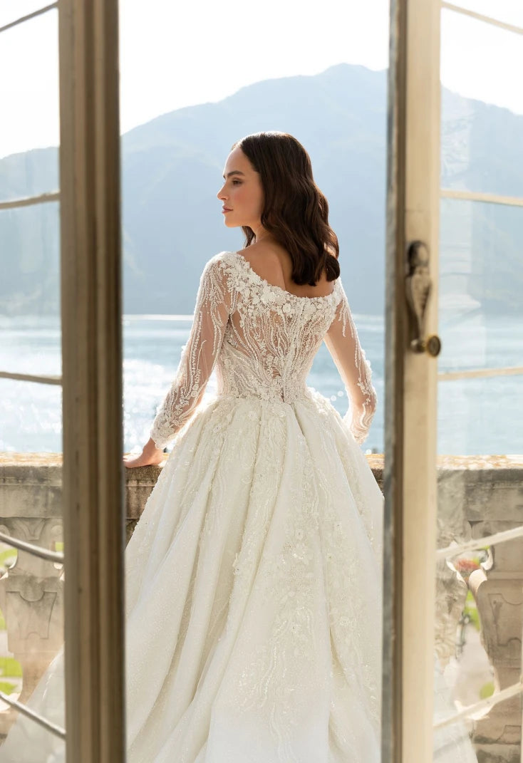 Make your wedding day unforgettable in this luxurious long-sleeve lace ball gown wedding dress from Ellie Belle Bridal. Designed for the bride who dreams of romance and sophistication, this gown features an intricate beaded lace bodice, sheer illusion sleeves, and a dramatic chapel-length train. Perfect for cathedral ceremonies, elegant ballroom receptions, or outdoor garden weddings, this gown delivers timeless beauty from every angle.