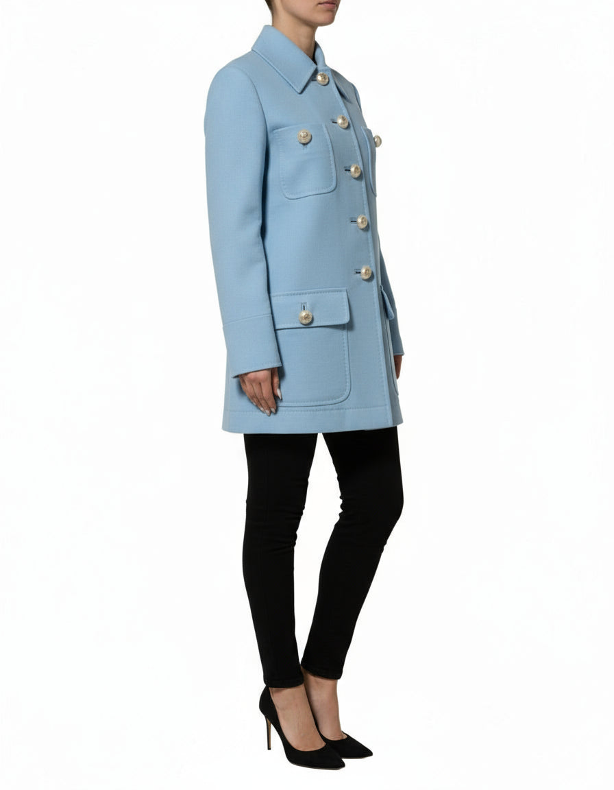 This Dolce & Gabbana coat comes in a light blue hue and includes a button-front closure that offers a sharp, tailored look. It features a notch collar and an extended length, reflecting fine Italian design. Ideal for adding warmth and style to both professional and everyday outfits during cooler seasons.