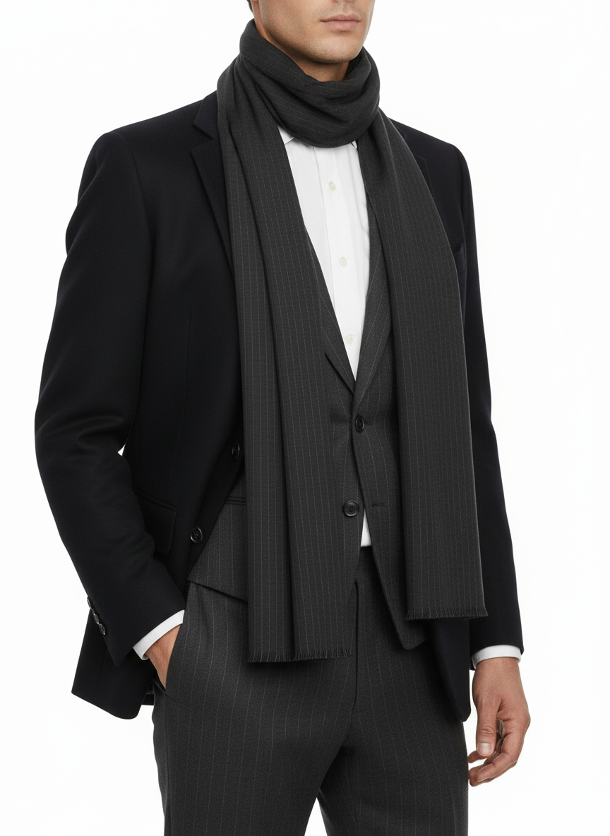 Crafted from premium 100% wool, this Dolce & Gabbana wrap scarf features a sophisticated gray striped design with signature logo accents. Expertly made in Italy, it combines timeless style with luxurious comfort for the discerning gentleman. SIZE: 180cm x 70cm.