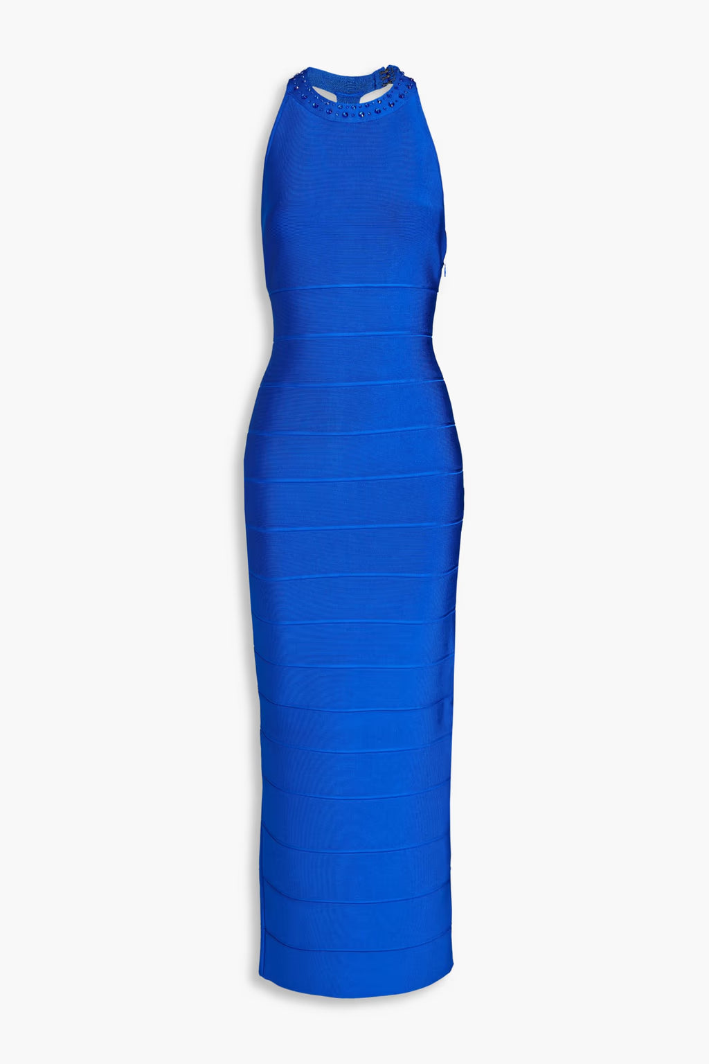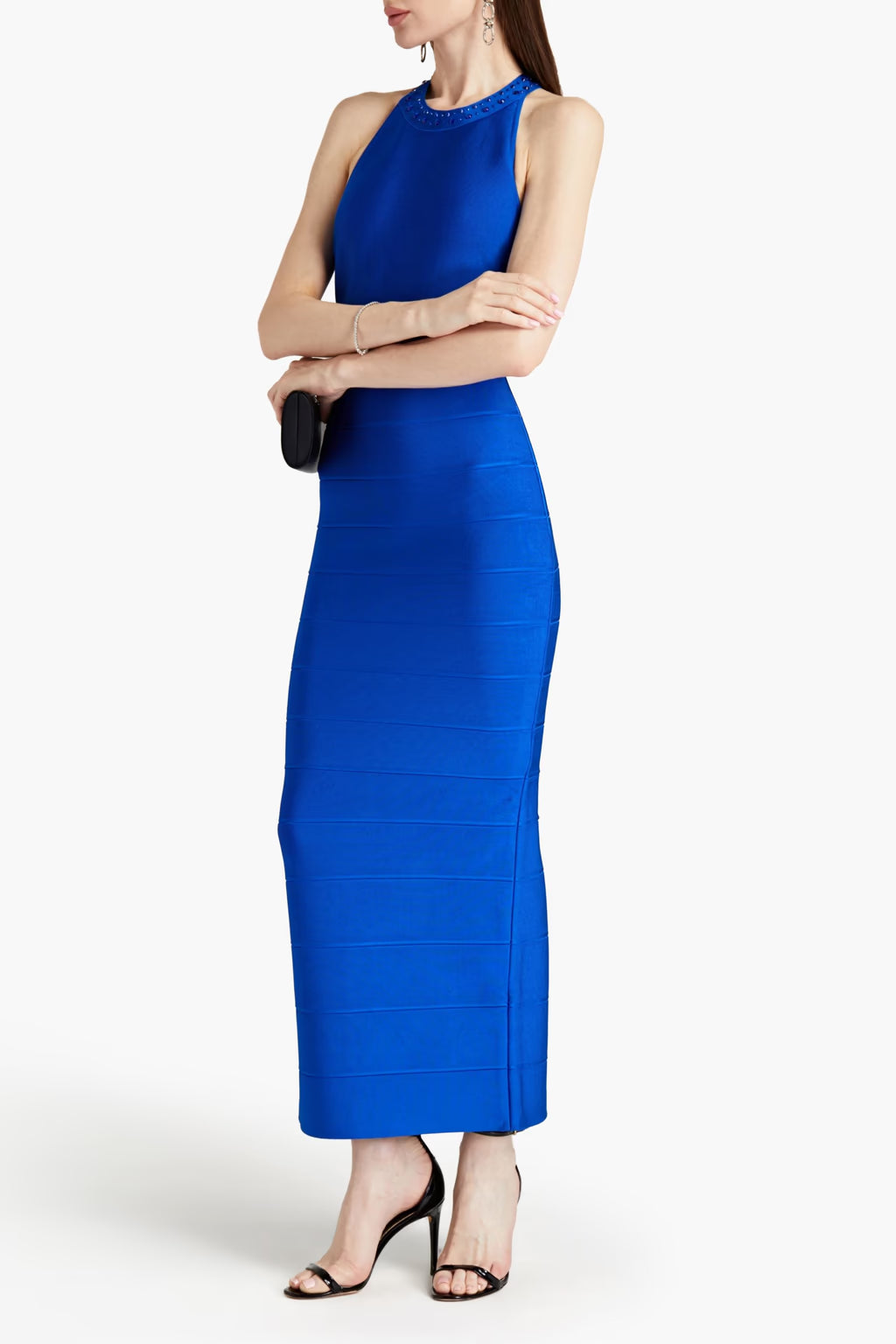 Designed with a bandage fit, this dress shapes the body to enhance your silhouette. The halter neckline provides an elegant touch, and the rhinestone-decorated back adds a stylish sparkle. Featuring a high back slit for comfort and mobility, this maxi dress suits special events perfectly. Combining comfort with a striking design, it offers a refined and captivating appearance.. made of 90% Rayon 9% Nylon 1% Spandex.