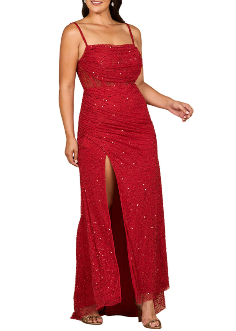 This sophisticated gown features a sweetheart neckline and a sheer bodice paired with a high slit. Designed with delicate spaghetti straps and a transparent back, this beaded corset dress promises to attract attention at any event.