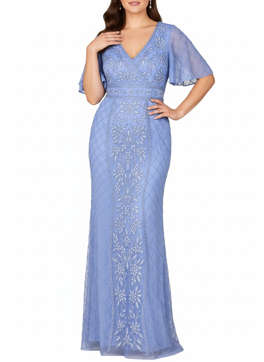 This sophisticated beaded gown combines timeless elegance with practical design. The high back and flowing mid-length cape sleeves provide graceful arm coverage, while the V-neckline adds a touch of refinement. Adorned with delicate beading throughout, this dress offers the modest styling and polished look ideal for mothers celebrating their child's wedding day.