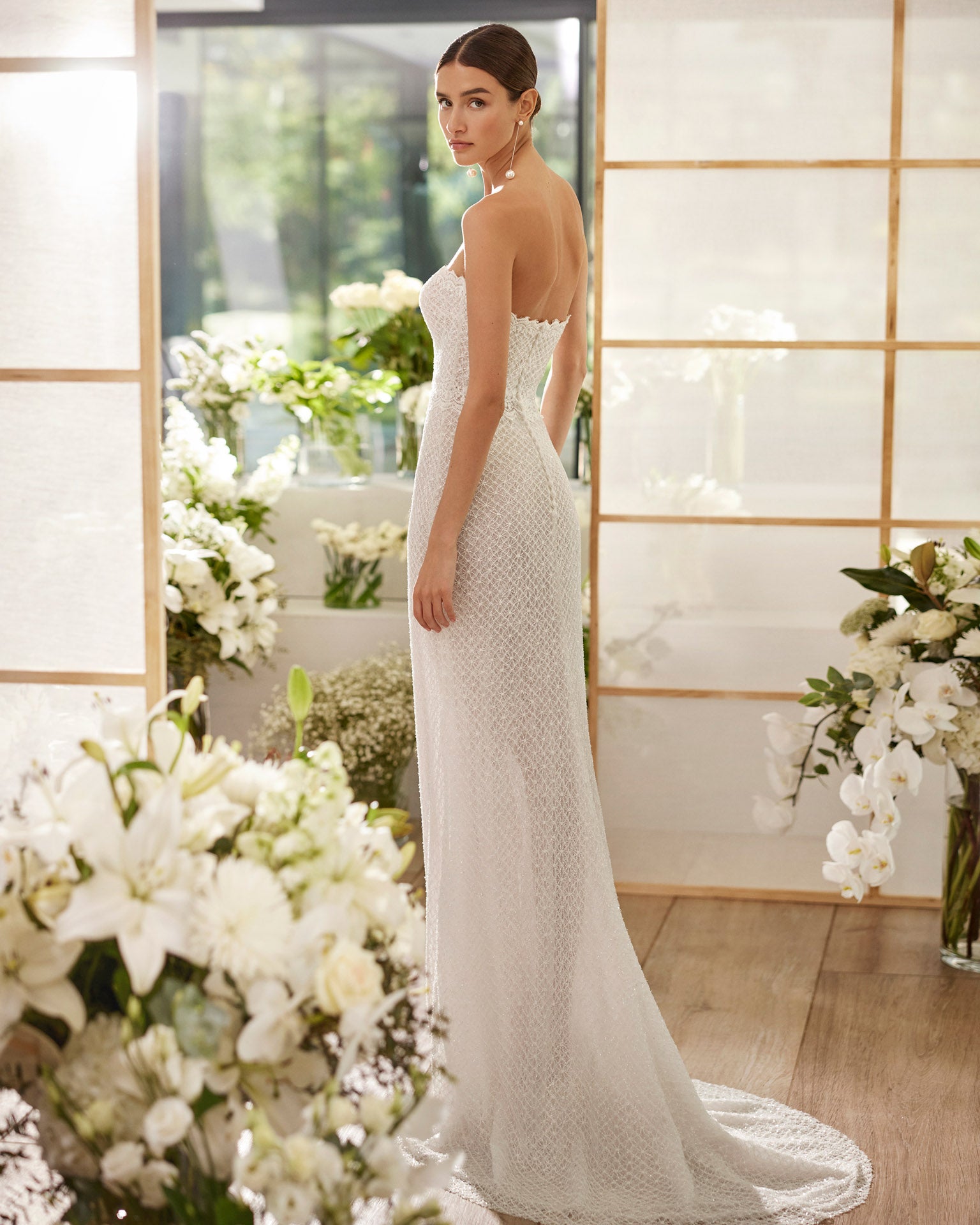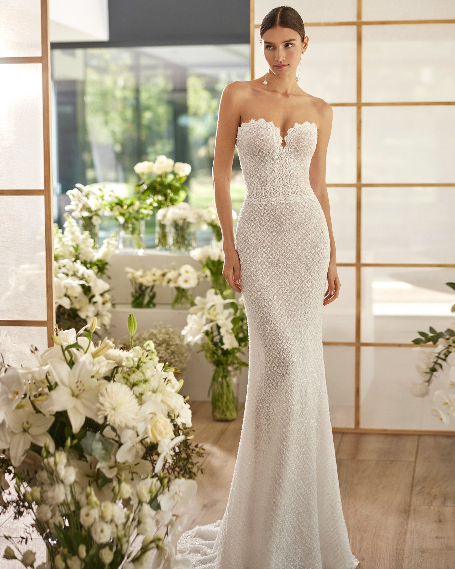 The Rosa Clará Couture Miranda gown is a vision of timeless elegance and the refined craftsmanship Rosa Clara is known for. This strapless sheath wedding dress features a delicately scalloped sweetheart neckline and intricate lace detailing throughout, creating a graceful silhouette that flatters from every angle. The gown features a strapless bodice, creating a soft, feminine frame across the décolletage. Its allover lace, delicately textured with geometric and floral motifs, elongates the silhouette and adds subtle dimension from every angle.