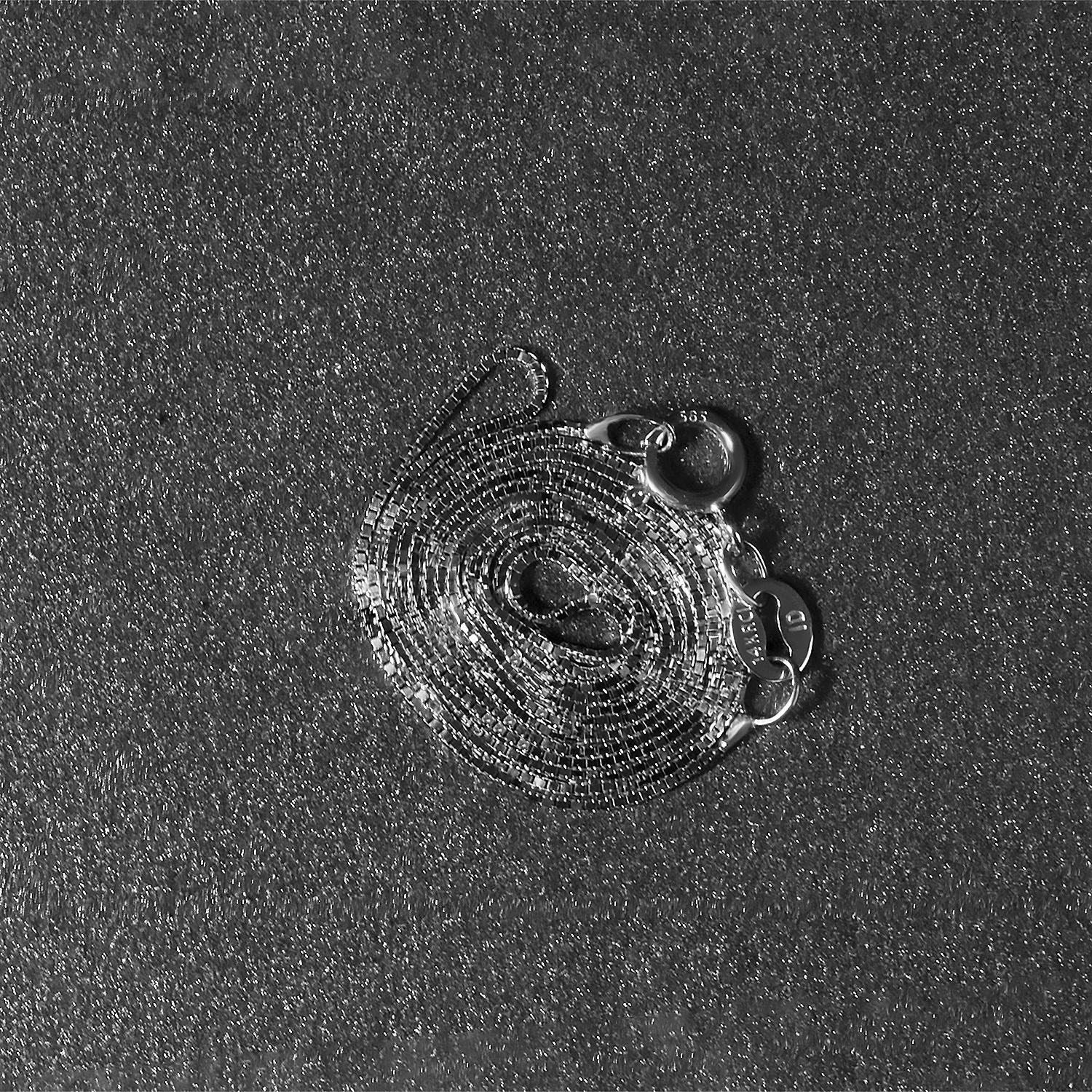 This classic box chain comes in 14k white gold and has a width of 0.6 millimeters.