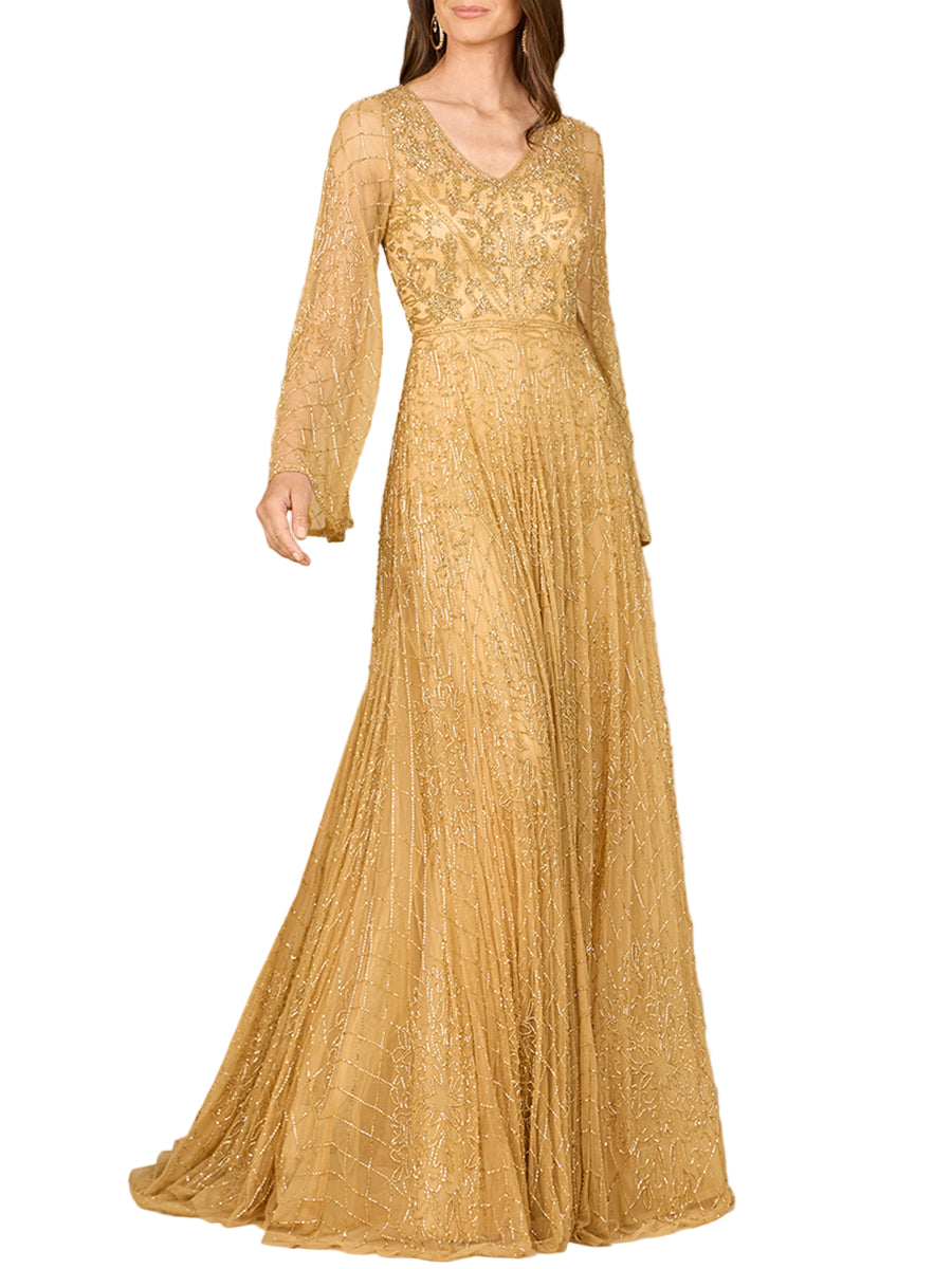 This dress showcases a flowing pleated skirt paired with long sleeves and a V-neckline. It is detailed with art deco-inspired embellishments arranged in a lined pattern. Expertly crafted, this gown is designed to leave a memorable impact at any formal occasion.