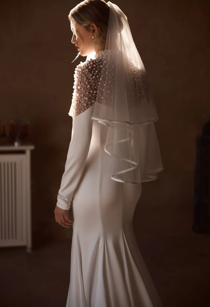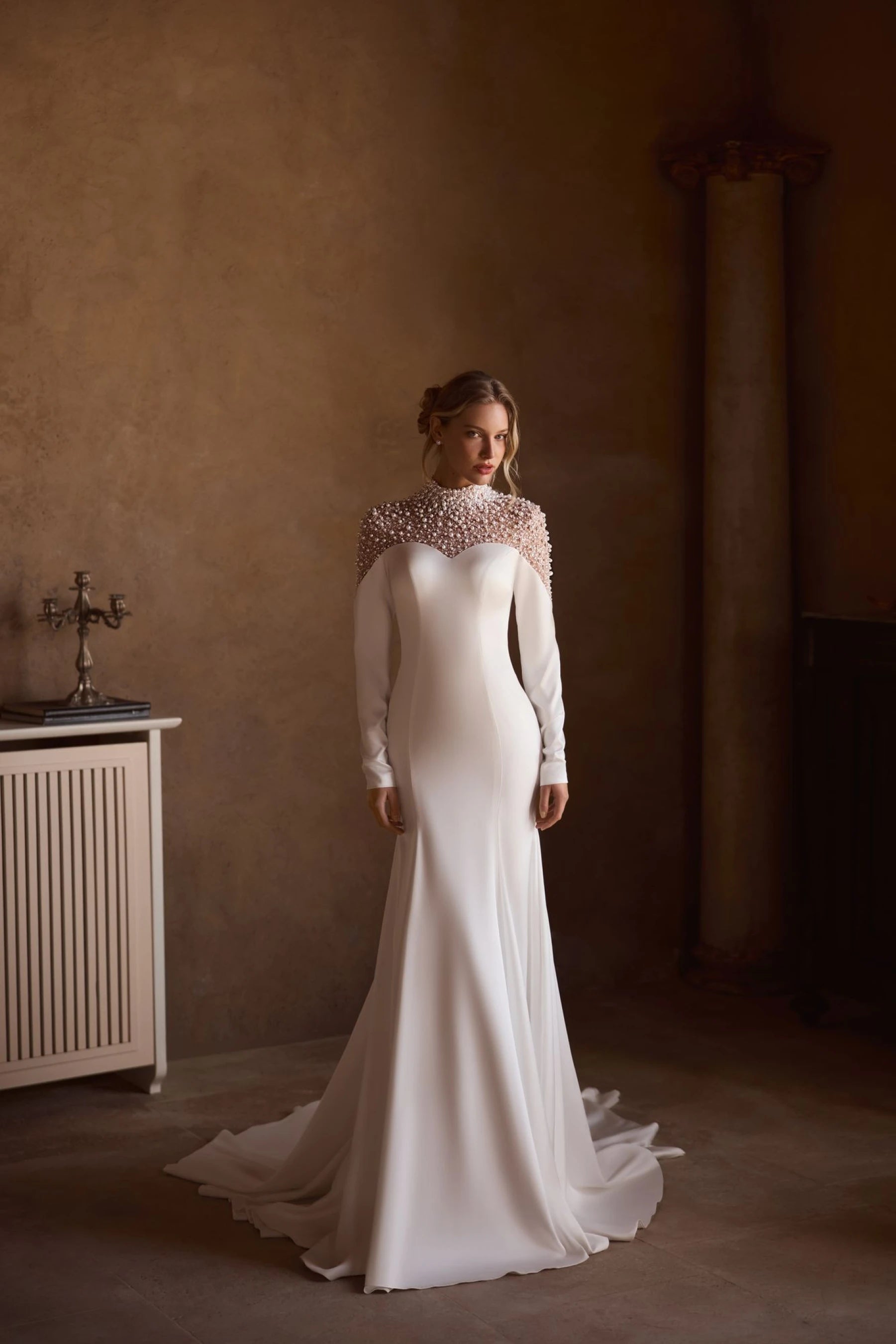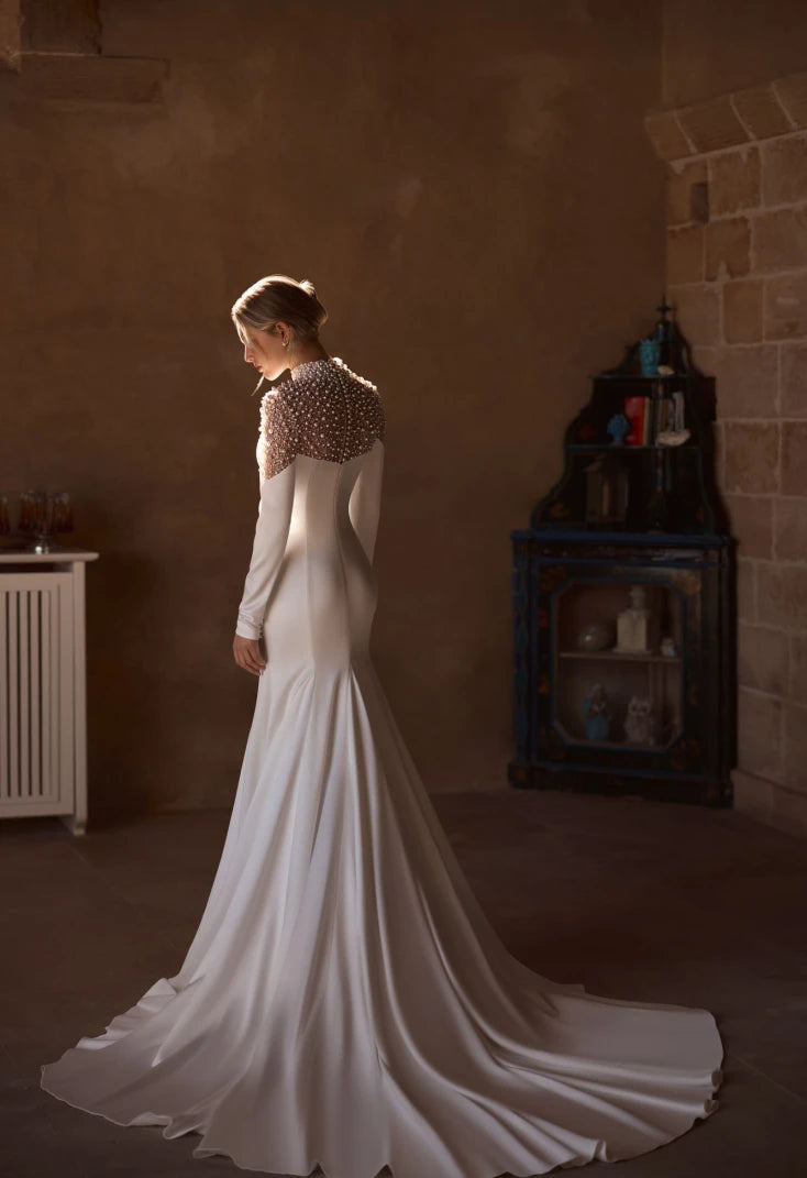 The bride will glide down the aisle in refined elegance wearing this ivory satin mermaid gown. Featuring a sculpted silhouette that hugs the hips and flares into a wide, sweeping train, the design is both timeless and striking. A sheer illusion tank top is delicately embroidered with pearls in varying sizes, catching the light with every movement. The long sleeves and high neckline offer graceful coverage, while the back closes with a row of covered buttons and hidden zipper for a seamless finish. Crafted in satin and tailored to perfection, this gown is a luminous choice for the modern romantic.