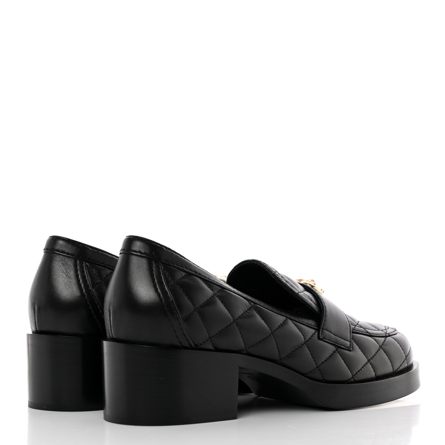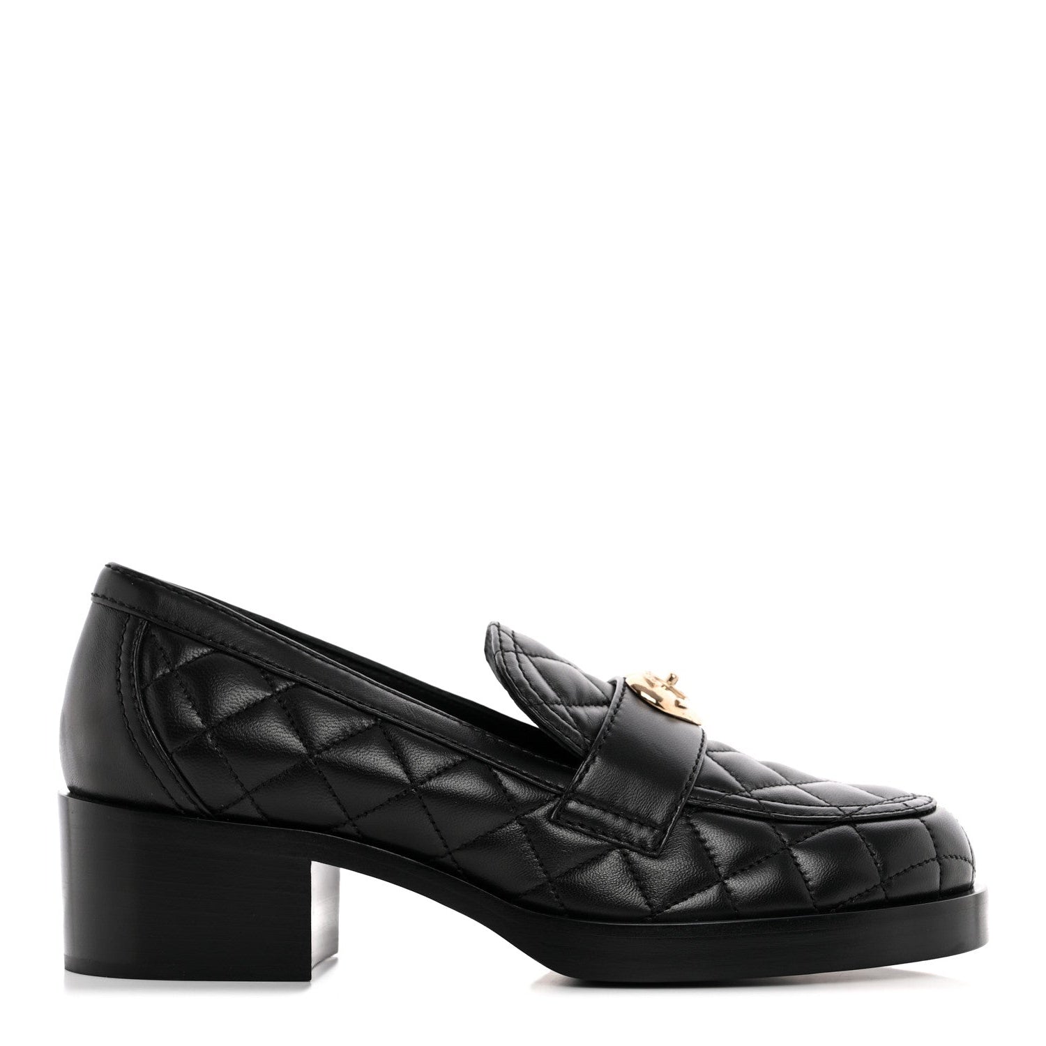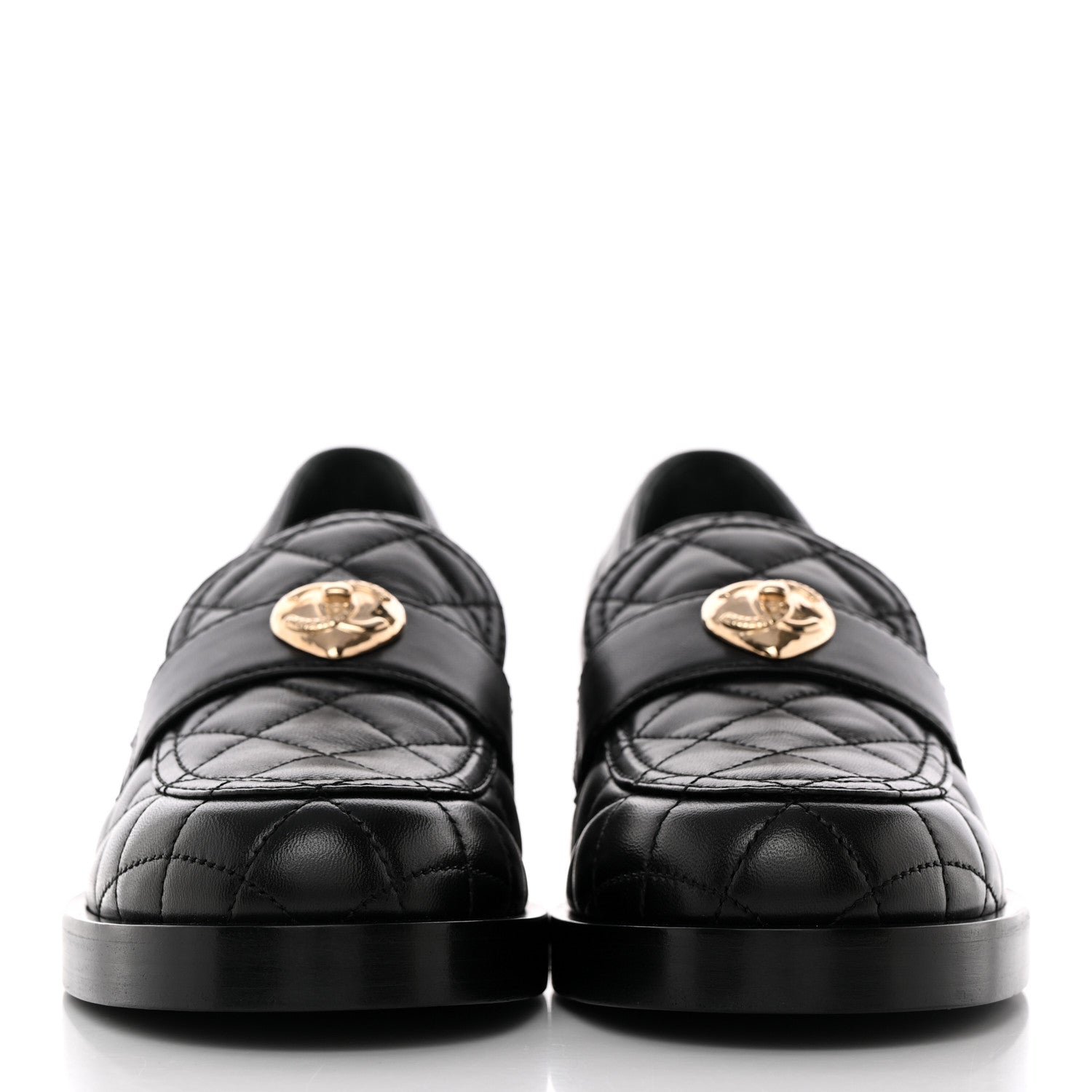 Chanel CC Quilted Heart Heel Loafers Black Lambskin Light Gold