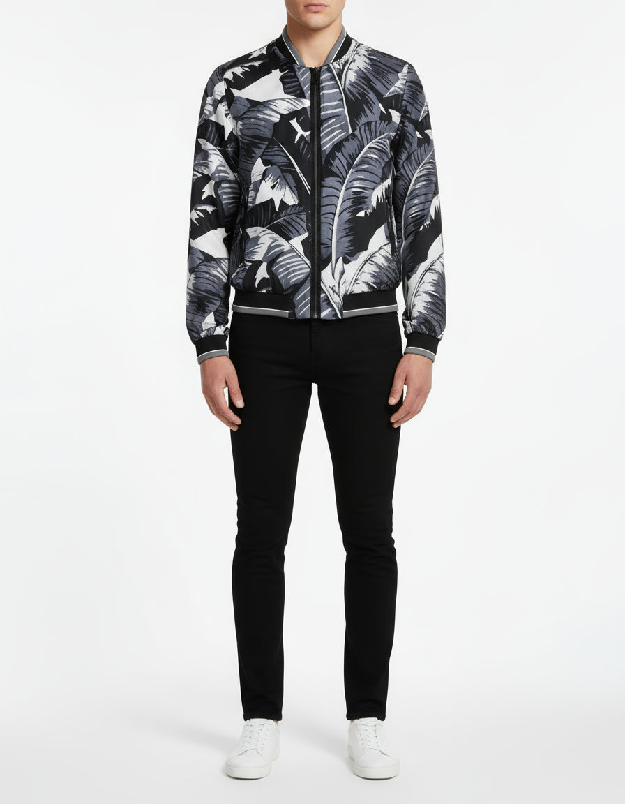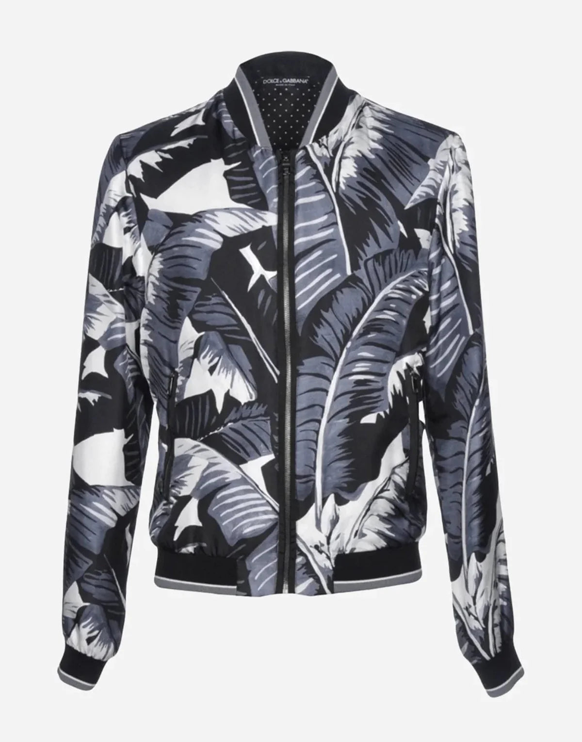 Elevate casual dressing with this Dolce & Gabbana tropical-print bomber jacket, crafted in Italy from a lightweight, silky fabric that moves with you. The black-and-white banana-leaf motif adds a bold yet refined edge, while ribbed trims and a sleek zip closure lend a timeless bomber silhouette. Perfect layered over a tee or paired with tailored trousers, this jacket embodies Dolce & Gabbana’s effortless blend of Italian sophistication and modern street style.