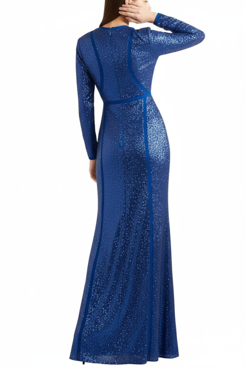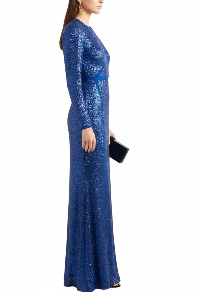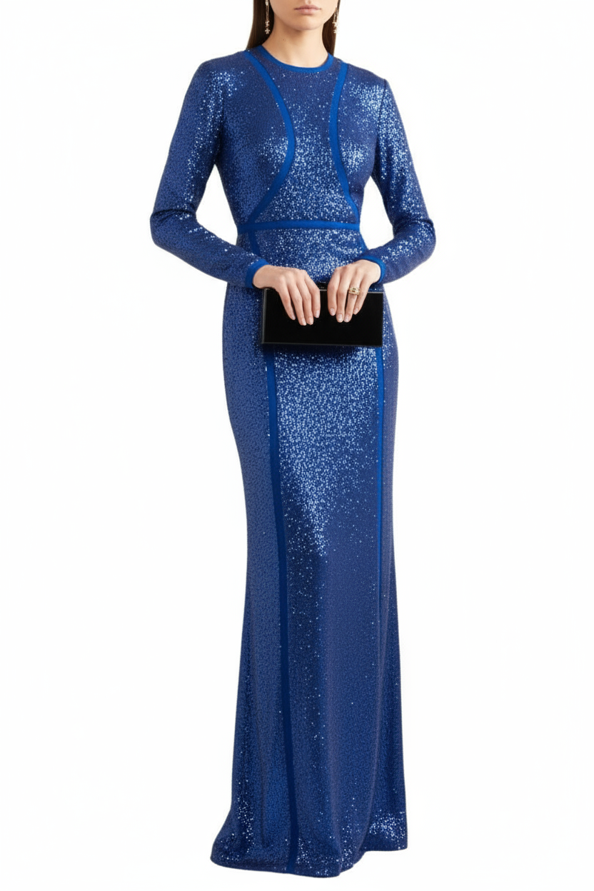 Elie Saab’s gown features a rich 'Pacific Blue' sequin design inspired by ocean tones and shimmering water. Made from a silk-blend fabric, it offers a close, figure-flattering fit with strategically placed tulle panels to enhance the silhouette. This floor-length dress includes long sleeves and translucent details for an elegant evening look. Crafted from tulle embroidered with various shades of blue sequins, it combines sophistication with a wave-like effect. The gown is lined with silk and made in Lebanon, suitable for formal occasions such as galas and awards ceremonies. France sizing.