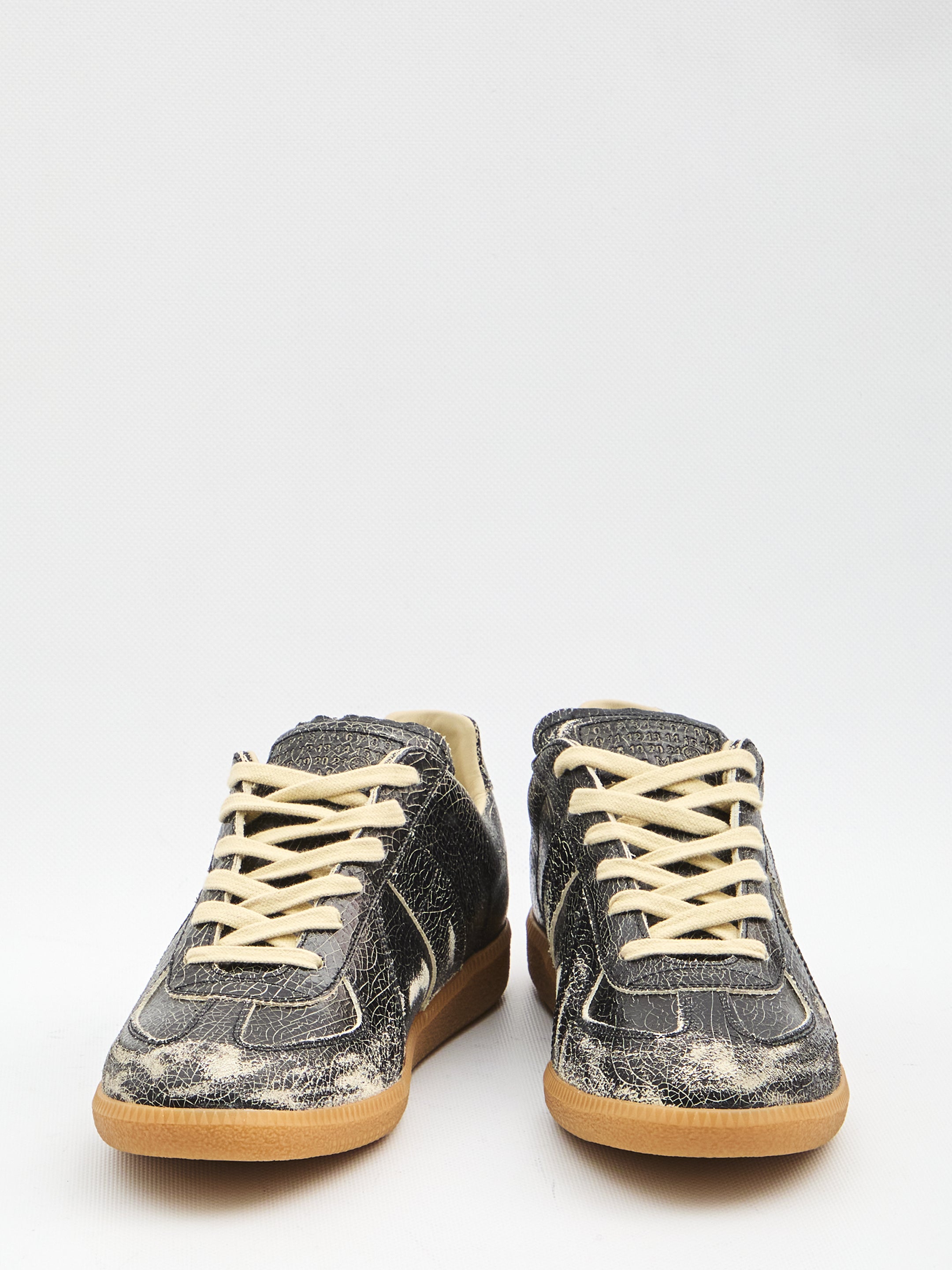 Crafted from black and white crackled calf leather, these Maison Margiela Replica Sneakers showcase the brand's iconic aesthetic with lace-up fastening and distinctive heel stitching. The tongue displays the signature numeric logo, while the interior combines cotton lining with leather for comfort. An intentional distressed finish adds character to the design. Includes dust bag. Size nationality: IT