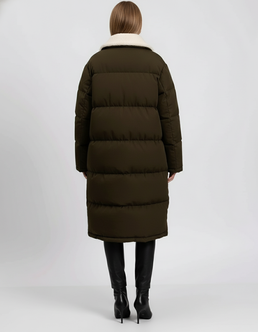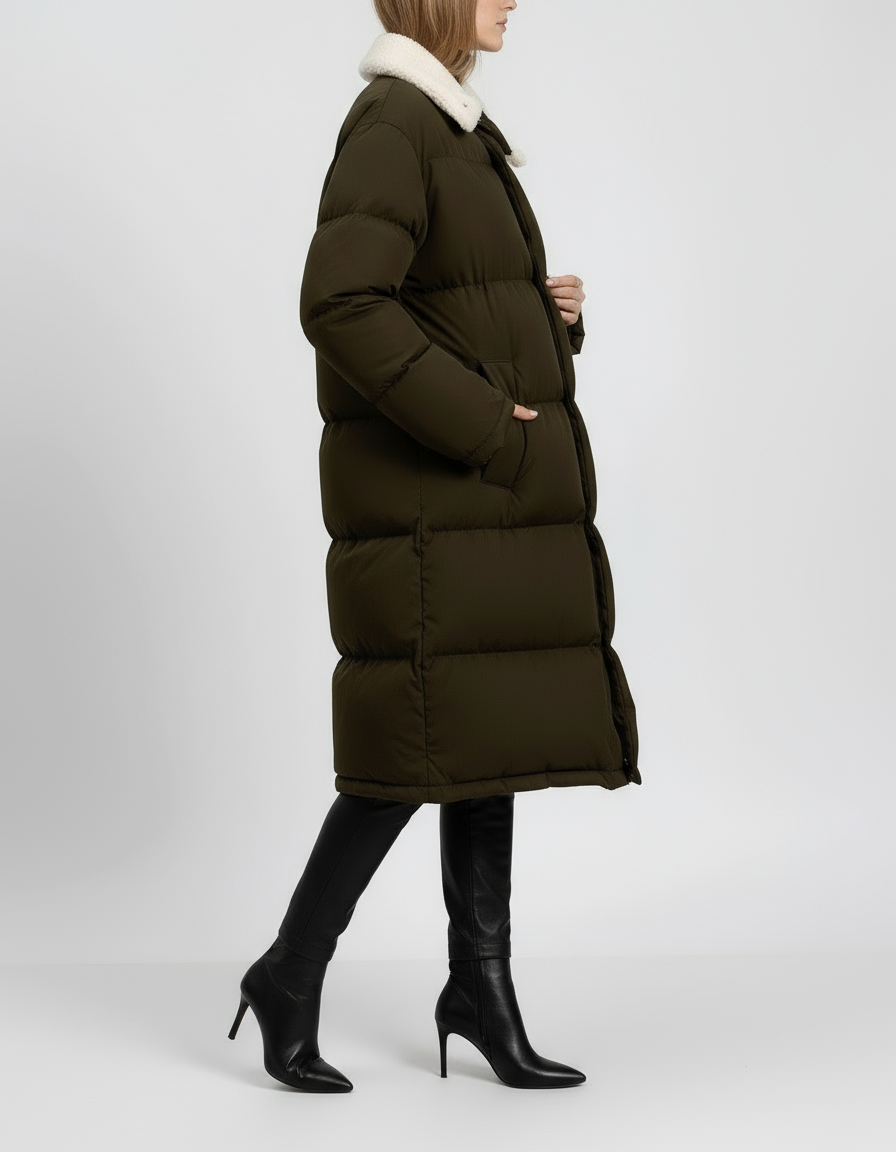 This is not your average puffer — it’s an elegant winter statement piece. The rich olive hue, elevated by the luxe shearling collar and subtle leather accents, transforms functional outerwear into a refined cold-weather essential.