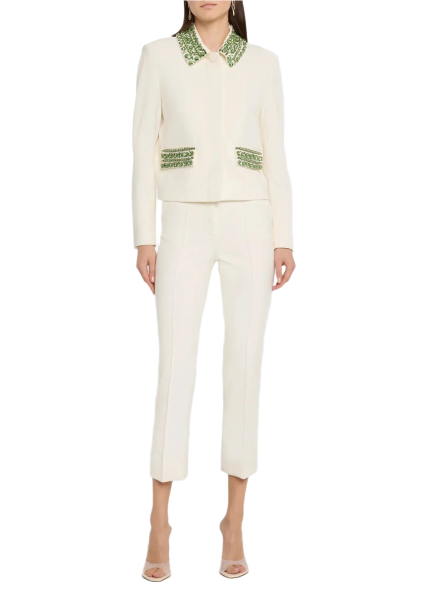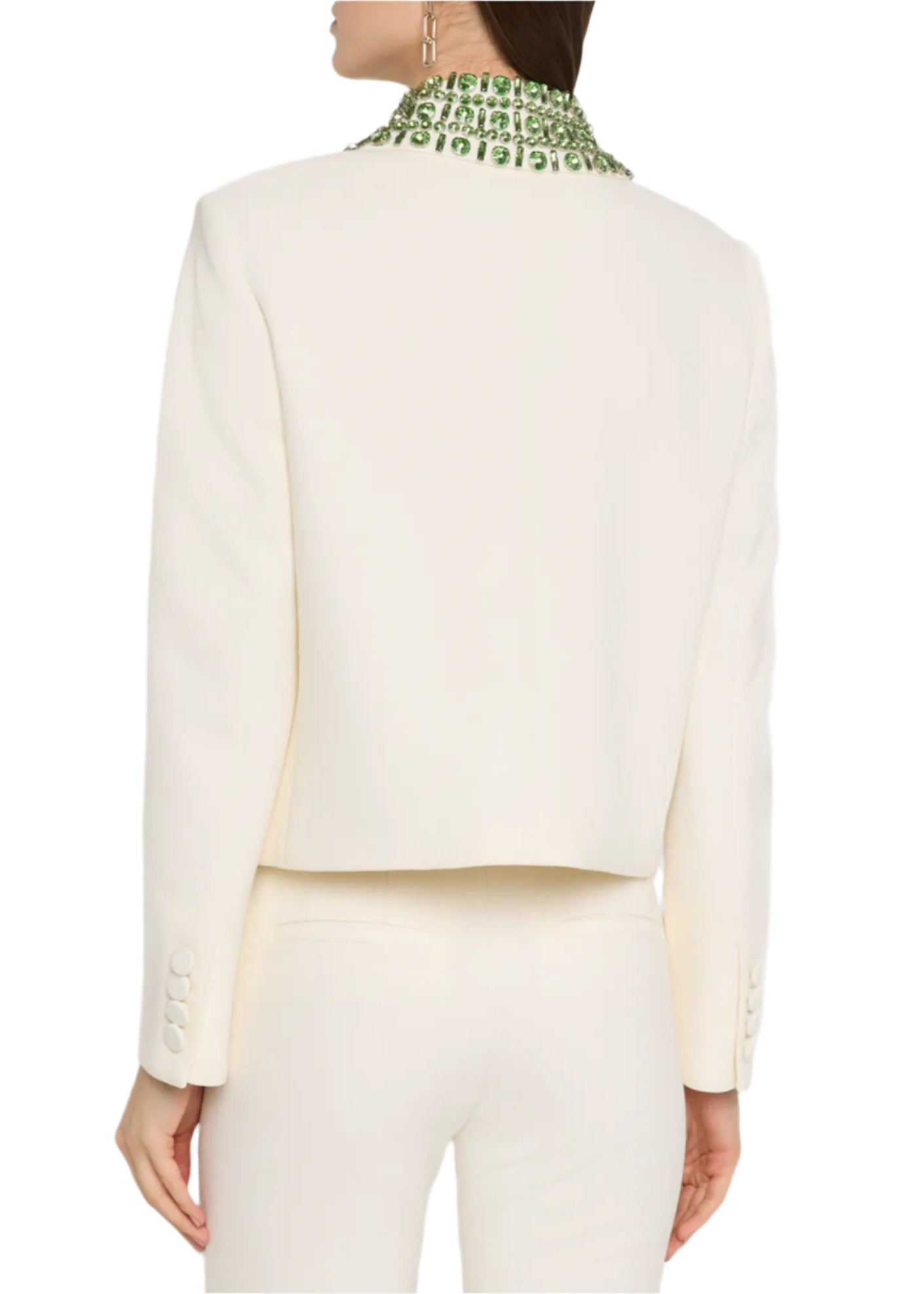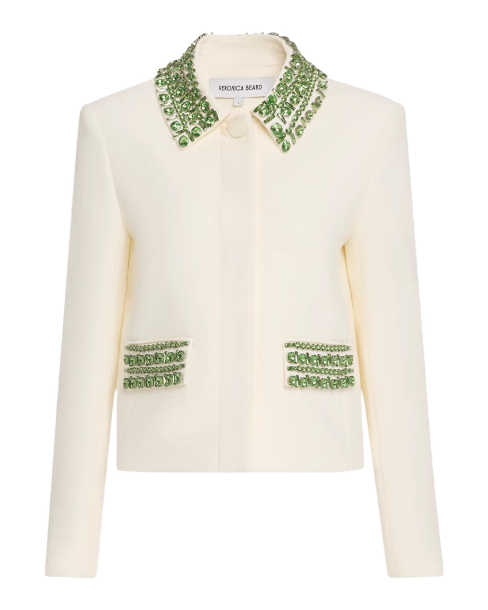 The Veronica Beard Imogen Embellished Cropped Jacket is crafted from a high-quality stretch blend, showcasing expert tailoring. This white, boxy cropped jacket is detailed with sparkling emerald rhinestones adorning the collar and pocket flaps. Spot clean only.