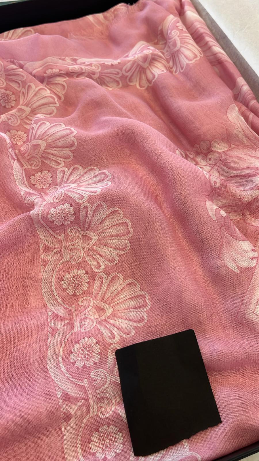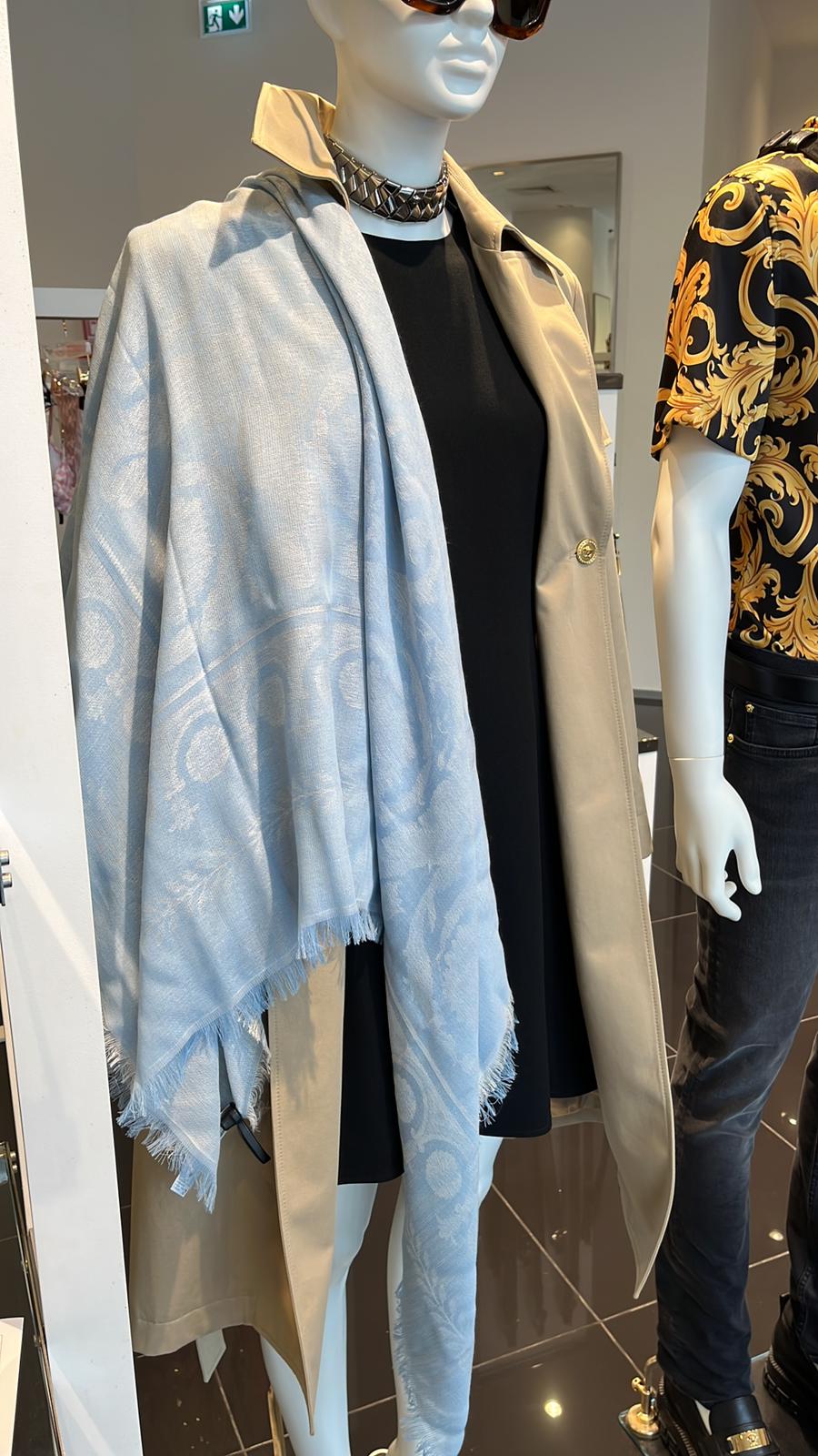 This Versace scarf features a light pink blend of silk, wool, and cashmere with a fine knit texture. It showcases the signature Barocco logo print on the front and has a frayed edge. Designed in a rectangular shape, it can be worn wrapped around for added style and warmth.