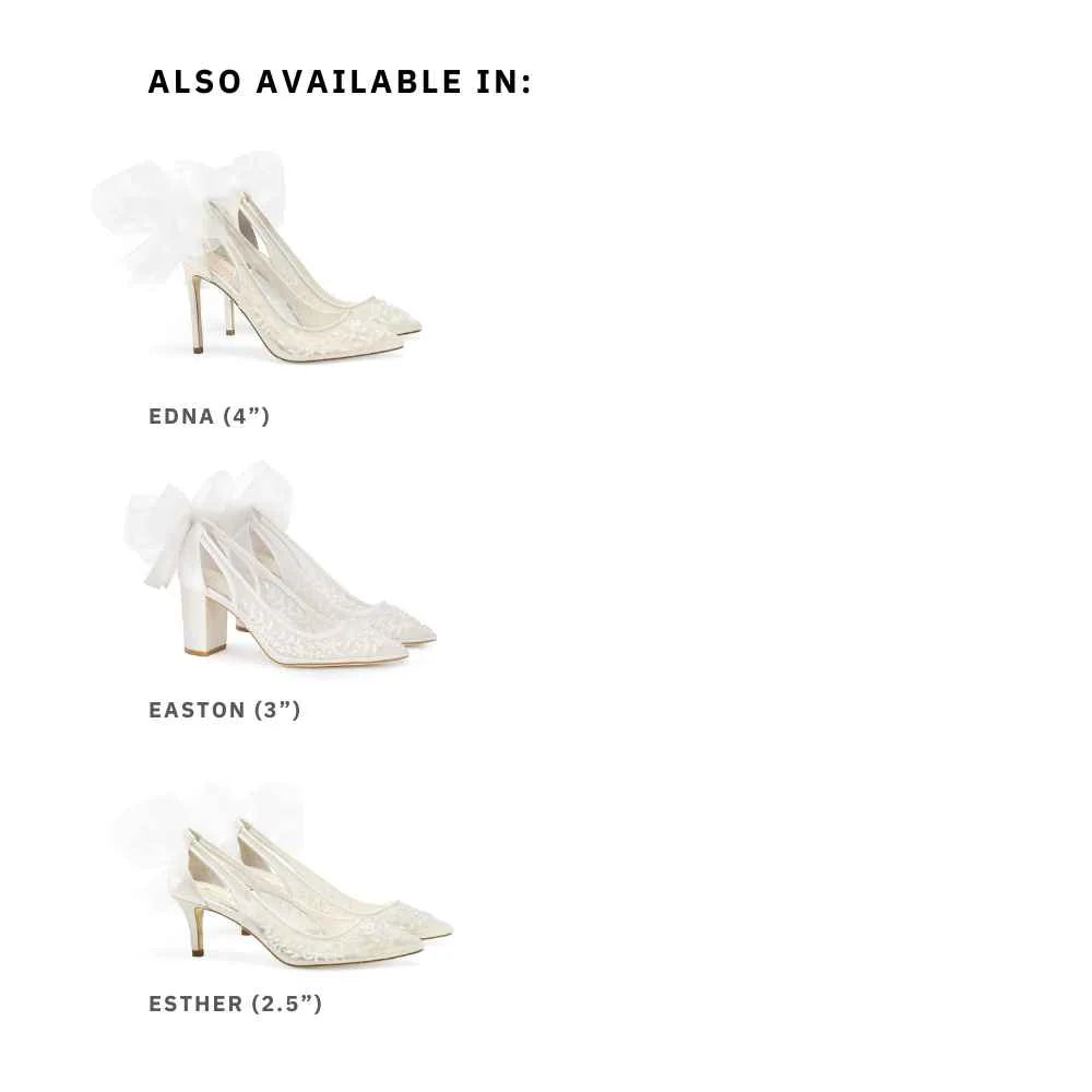 The Bella Belle Edna heels capture timeless elegance with a modern, romantic twist. Standing at 4 inches, these ivory lace wedding heels are crafted from delicate illusion mesh and silk, designed to flatter while offering a comfortable, breathable fit. Hand-embroidered floral lace overlays create a soft, ethereal texture, while removable tulle bows and optional ankle straps let you customize your look—from classic sophistication to playful femininity.