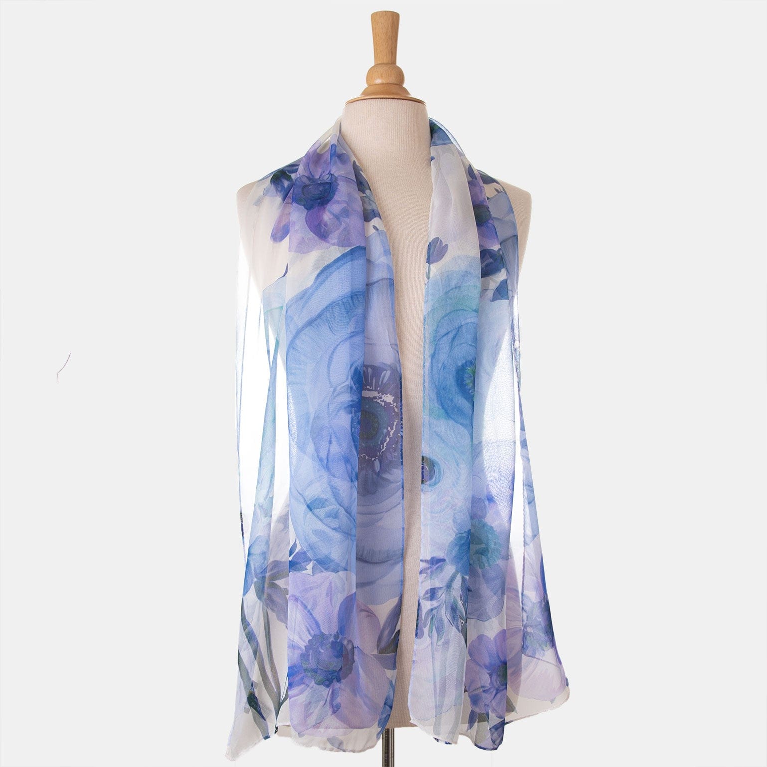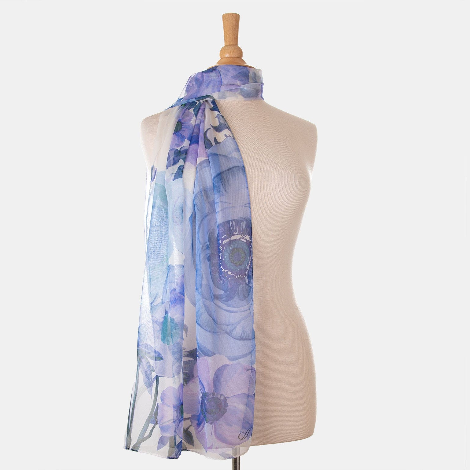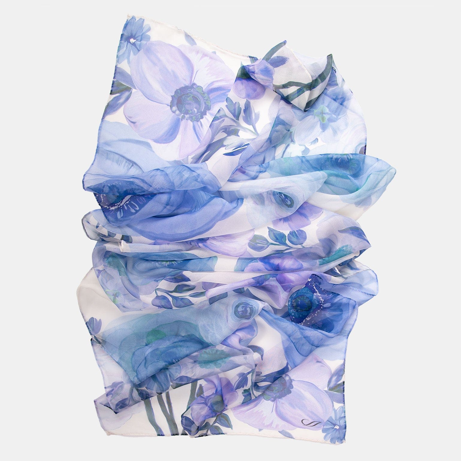 Nommée d'après la célèbre place de Rome, Campo de' Fiori (champ de fleurs), cette longue écharpe en soie georgette transparente présente un imprimé floral dans des tons de bleu.