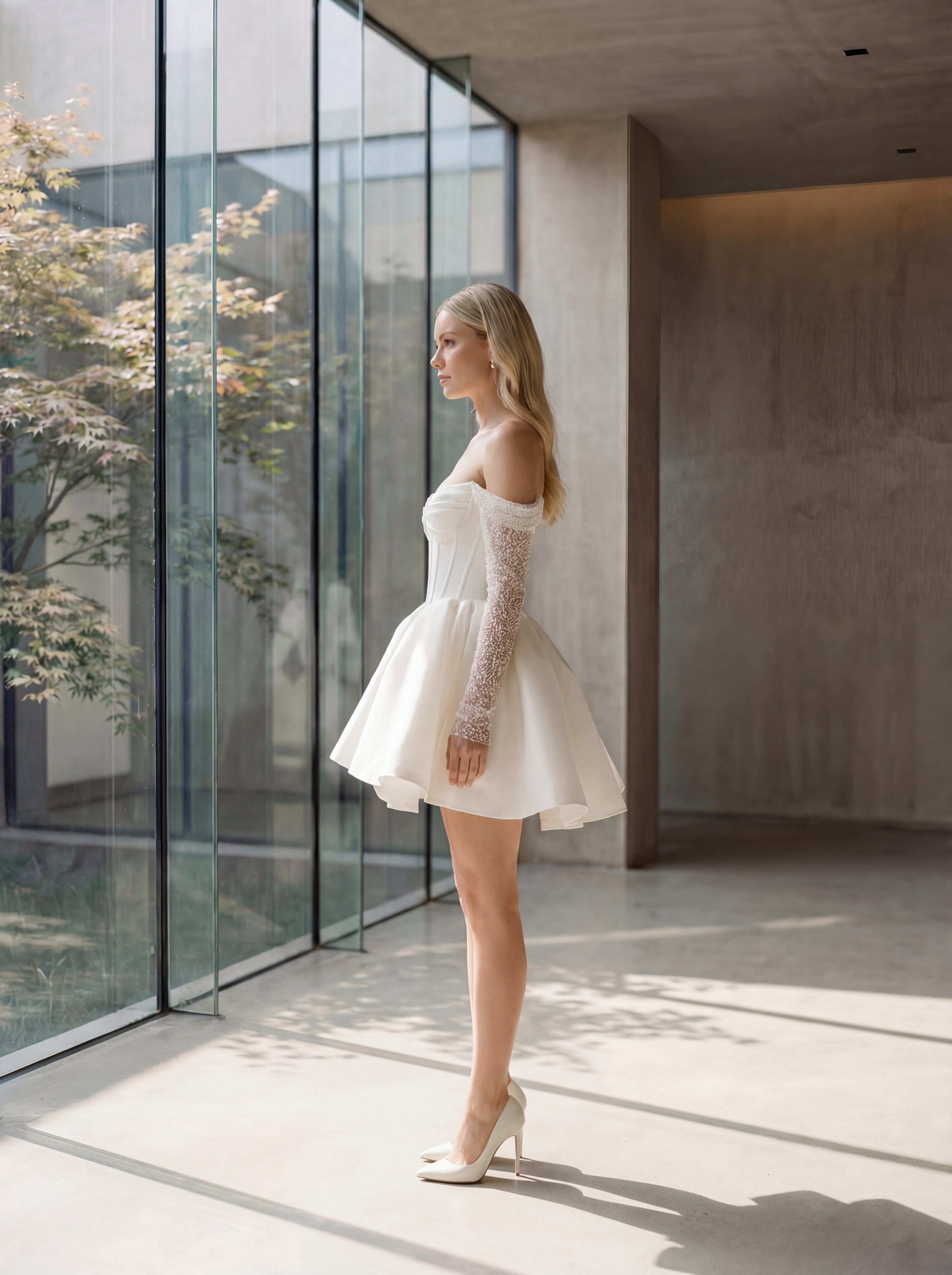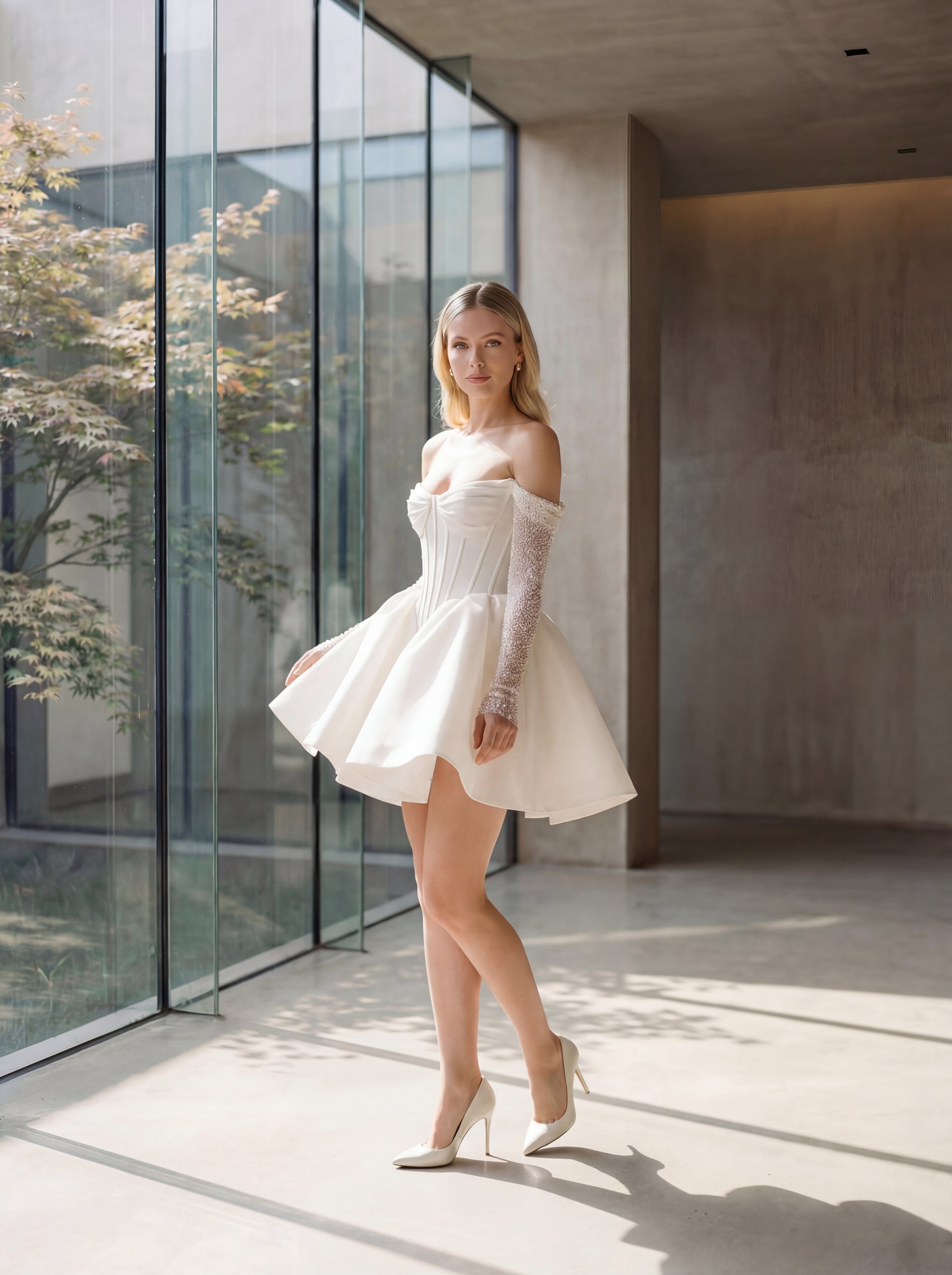 The Ellie Belle Kelly is structured confidence in dress form. An off-the-shoulder sweetheart corset bodice with exposed boning defines the waist with architectural precision, while long pearl and crystal embellished sleeves add a layer of bridal drama that reads as intentional from every angle. The voluminous A-line skirt in clean ivory satin flares dramatically from the corset waist, layered and full, falling just above the knee with the kind of movement that photographs beautifully in any light. The Kelly understands that a short dress can carry as much presence as any gown, and then proves it.
