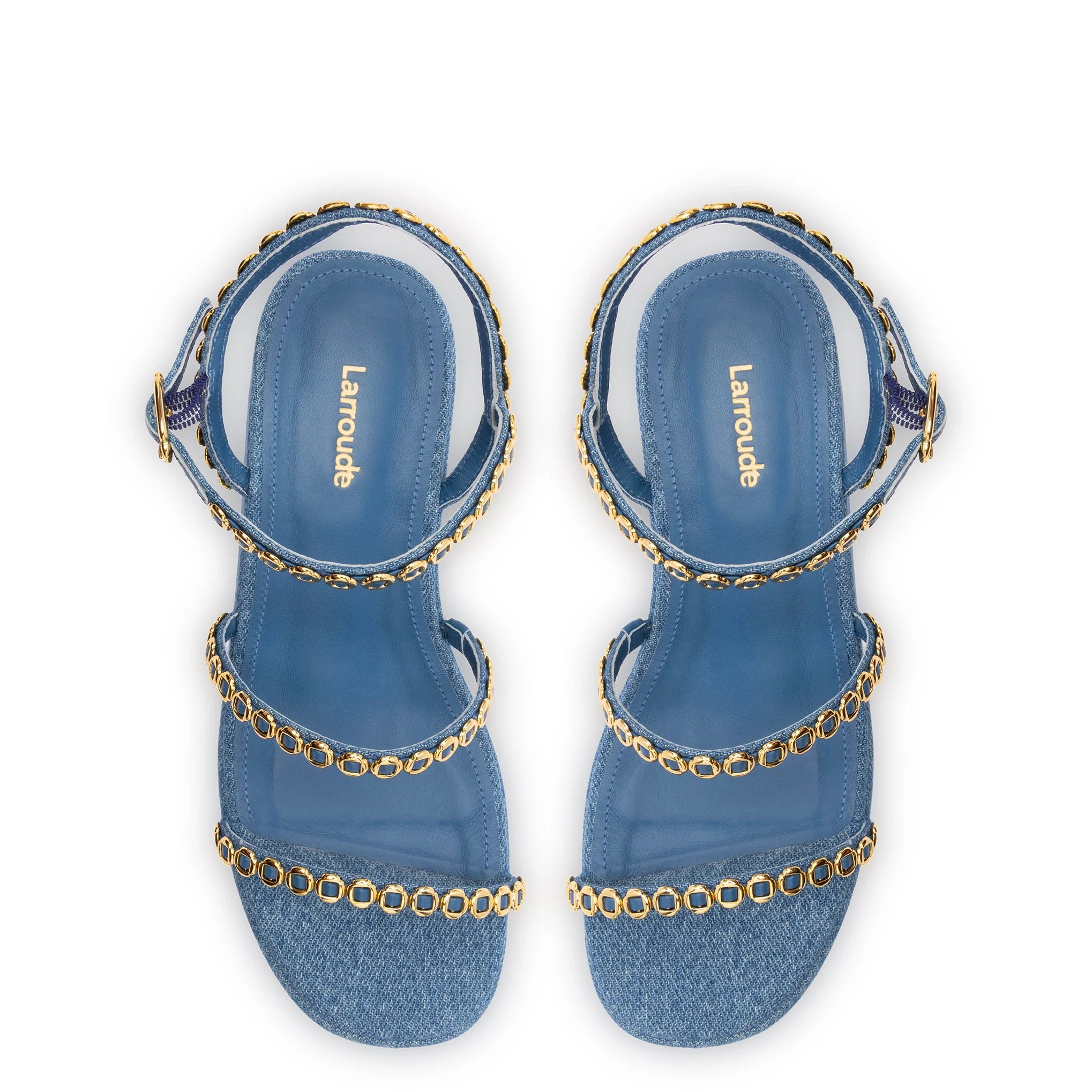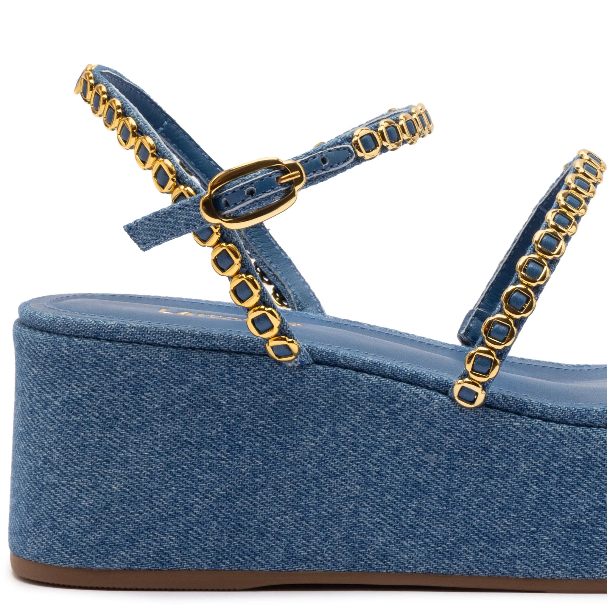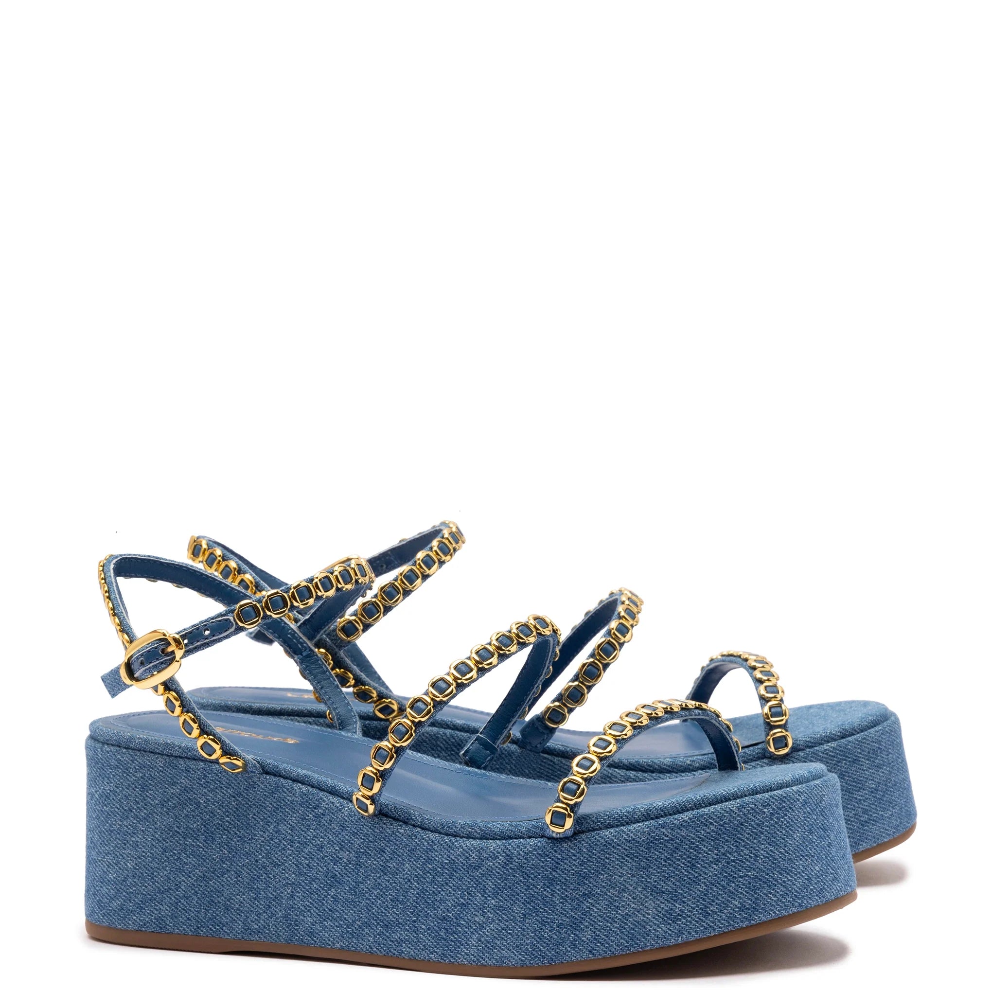 The Gio Milanina Flatform Sandal in Blue Stoned Raffia combines the minimalistic design of the Gio with the trendy style of our popular flatforms. This denim-covered sandal features a platform sole that adds height and enhances its overall look. By Larroude
