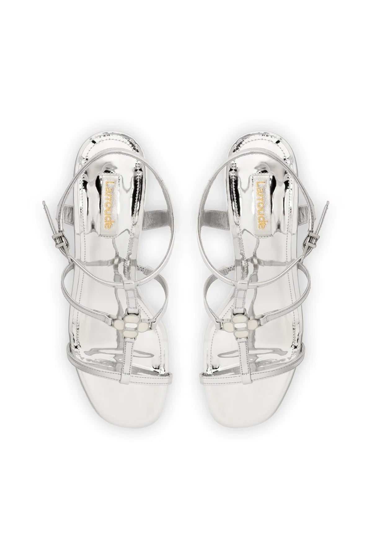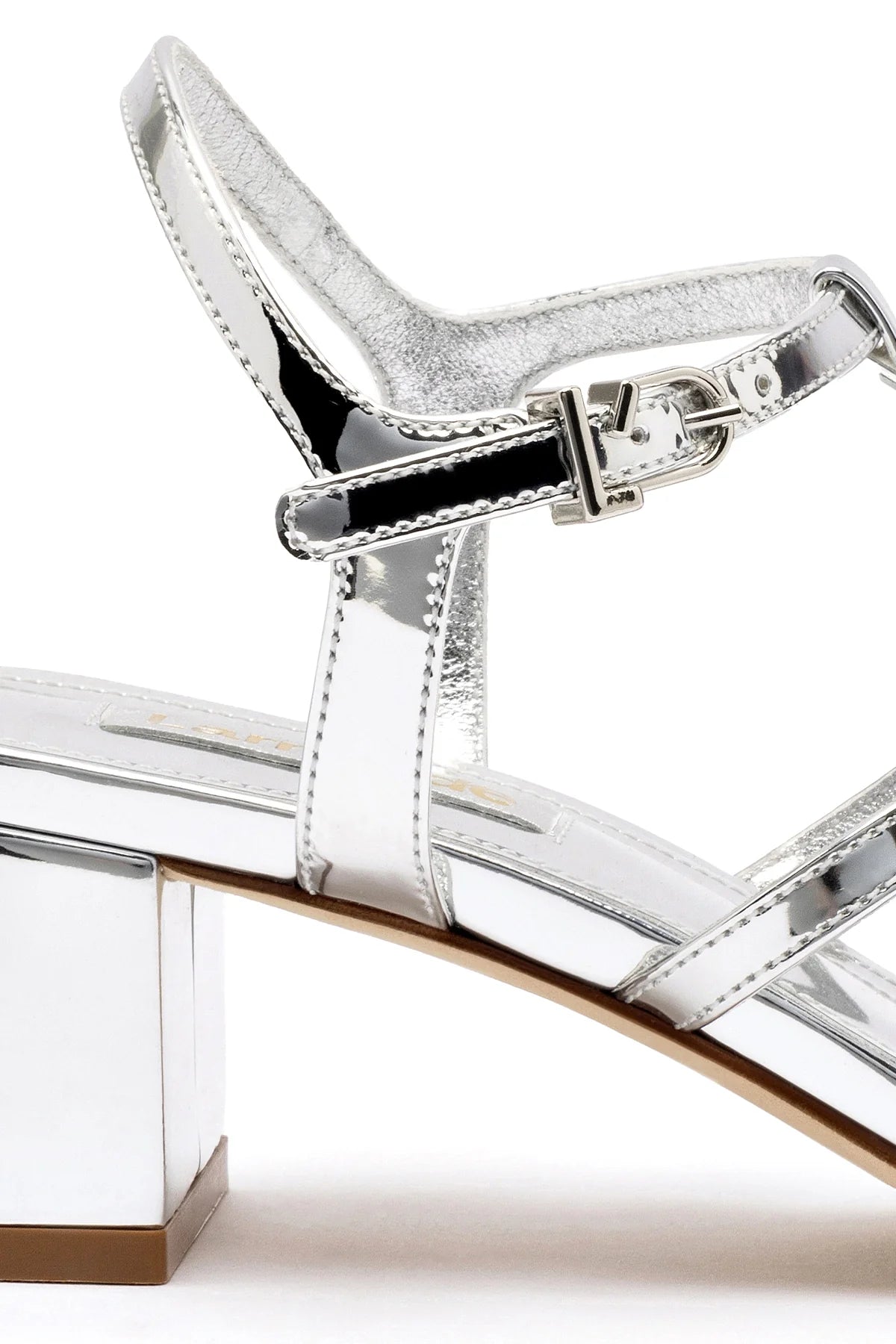 This city sandal features an ultra-feminine design with a mirrored metallic finish. Its gladiator-inspired style combined with a practical block heel offers both versatility and comfort. By Larroude